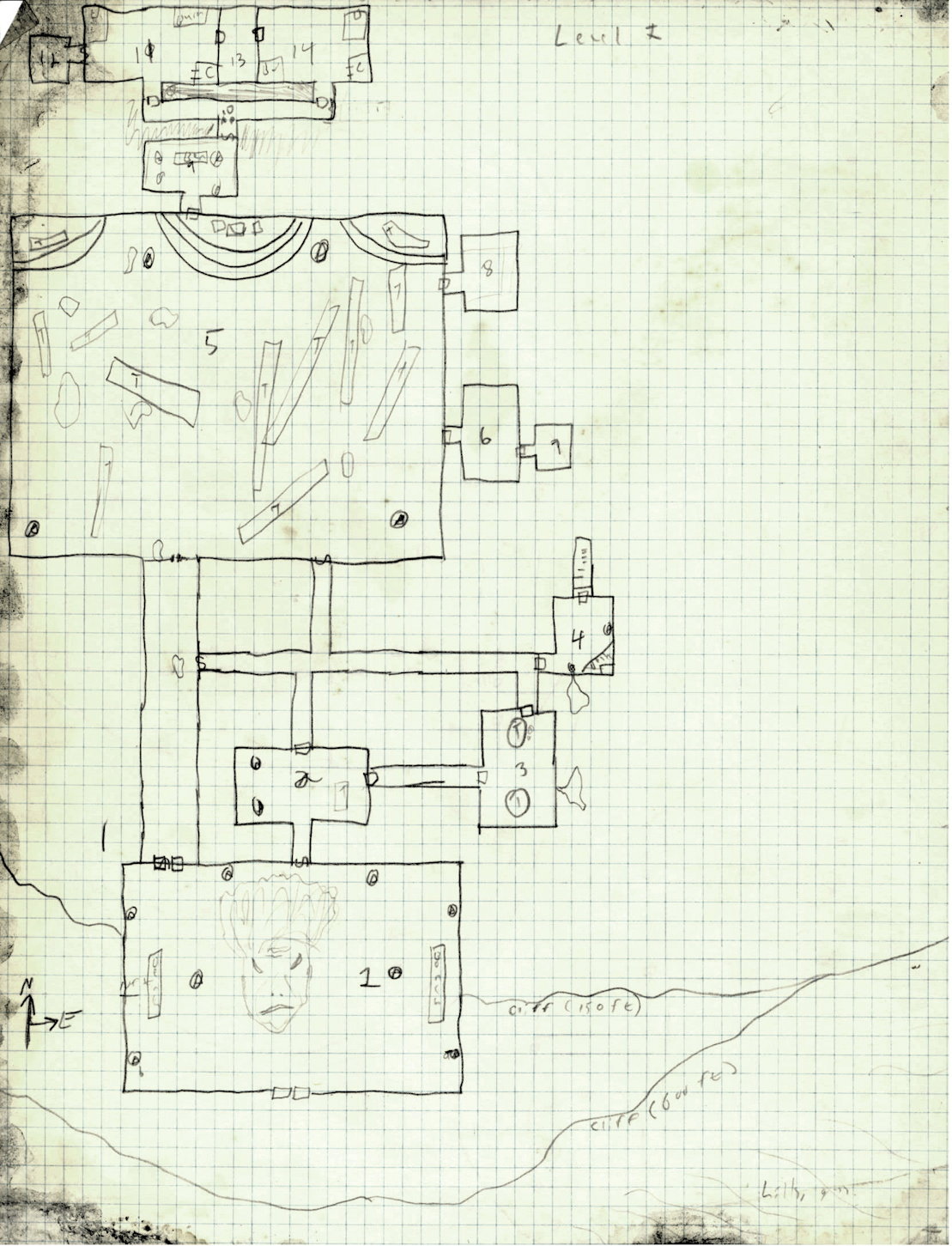 5) There are lots of holes in this room, leading down into darkness. If the party was not silent coming here, 10 Crabmen will attack, in an attempt to test the strength of the party. They are hiding behind tables, etc. If they have NO chance of winning, they will retreat, down the holes. The dots with As in them are statues.