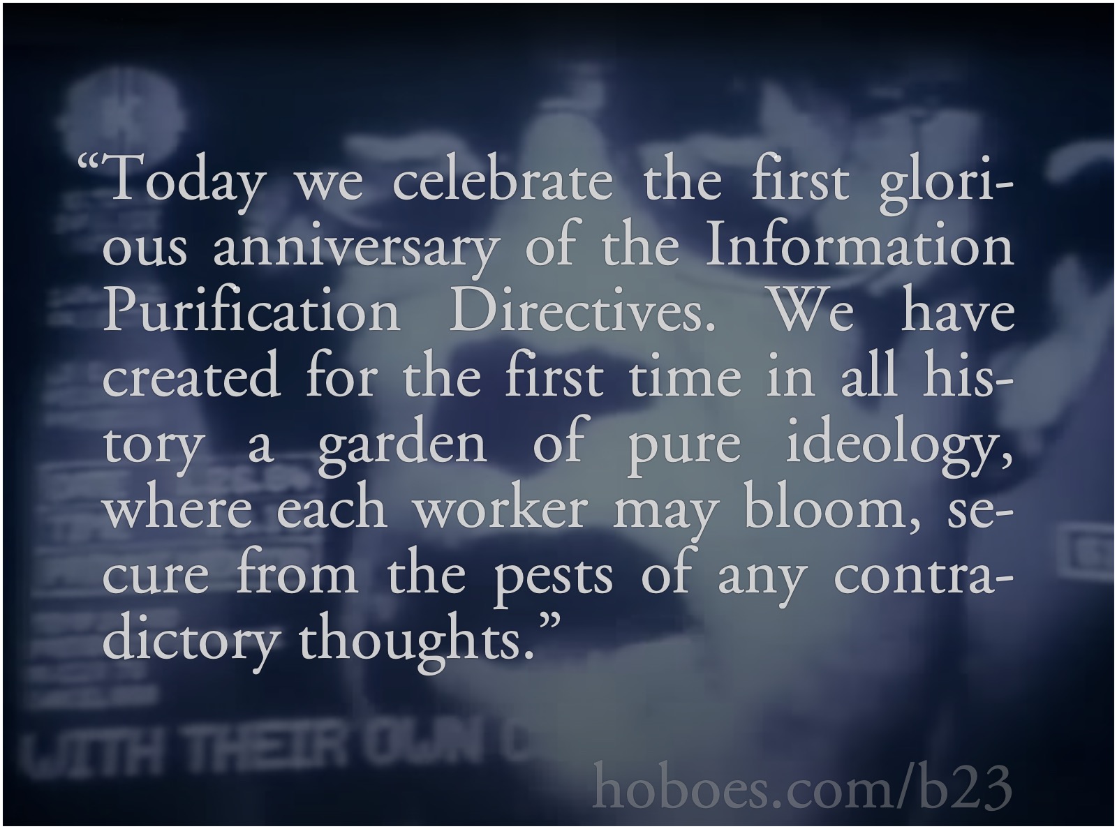 - Macintosh’s 1984 ad riffing on 1984. “Today we celebrate the first glorious anniversary of the Information Purification Directives. We have created for the first time in all history a garden of pure ideology, where each worker may bloom, secure from the pests of any contradictory true thoughts.”