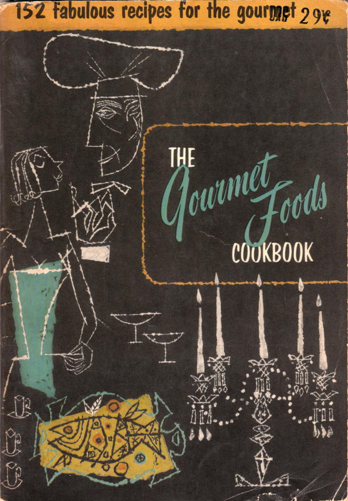 There are two sections: the main floor, where books are priced according to format—$2.00 for hardcovers, $1.25 for softcovers, etc.—and the stage, where somewhat more collectable books are priced individually. The most expensive and the least expensive books I acquired here came from the stage. In the cookbook section on the stage, there was a basket of free pamphlets, and I found The Gourmet Foods Cookbook there. It’s a 1955 cookbook with amazing retro artwork. Potentially some good recipes, too—Luscious Pistachio Cake, for example—but I mainly picked it up for the cover and interior art.