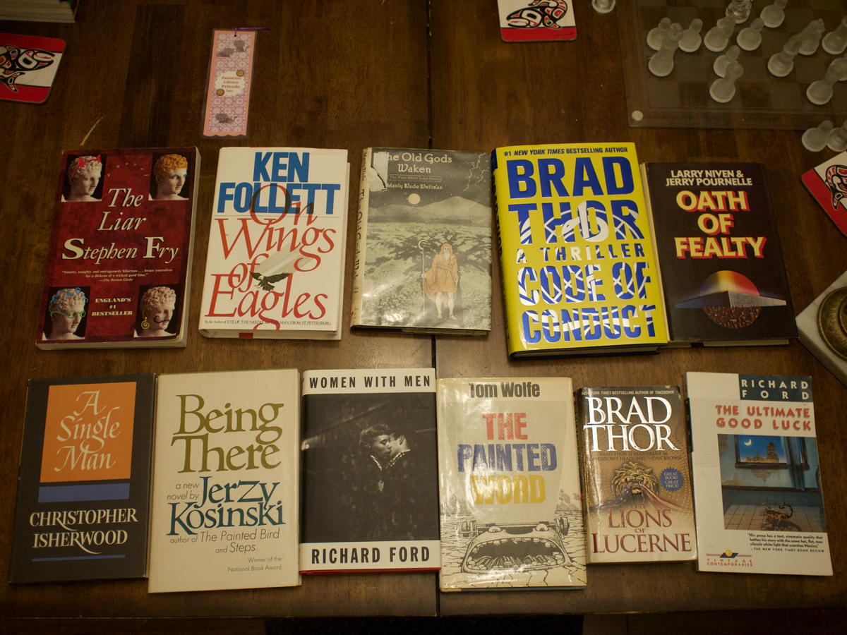 It’s a one-room sale, crowded with books—I overheard one person say that it was like Black Friday for books, which was an accurate description. Most of them are general fiction; there is a table dedicated to science fiction and fantasy, but I found the Manly Wade Wellman book and the Pournelle-Niven book in the general fiction section. I’m pretty sure I found Tom Wolfe’s book in the general fiction section, too, even though it isn’t technically fiction.1