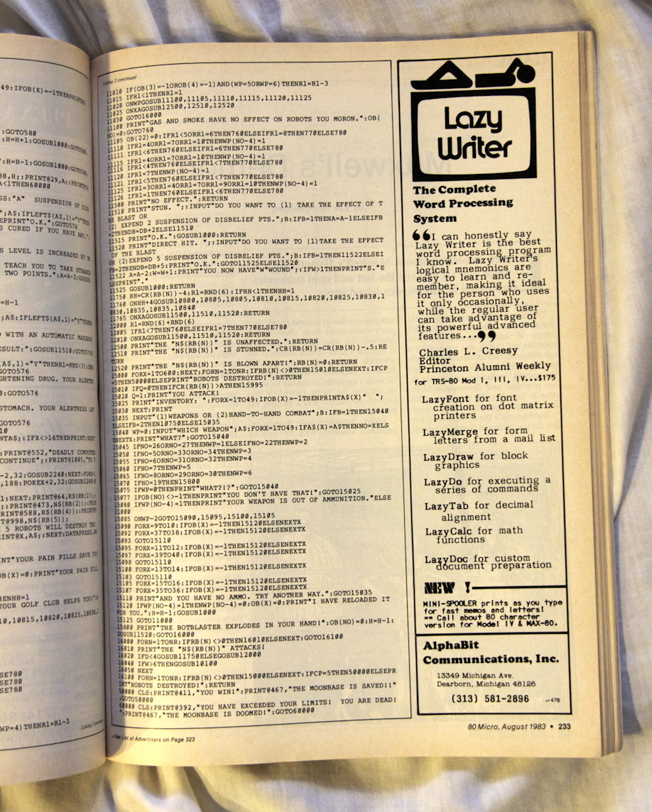 While Welsh was writing “numbers and lists” programs, he also started writing a utility to make it easier to write documentation for his programs. And then he realized that not only was writing going to be a hot new class of software, but that few people had realized it yet. He had time to be among the first-to-market. He wrote Lazy Writer, and he and his wife marketed it through the computer magazines of the time, mainly Wayne Green’s 80 Micro.