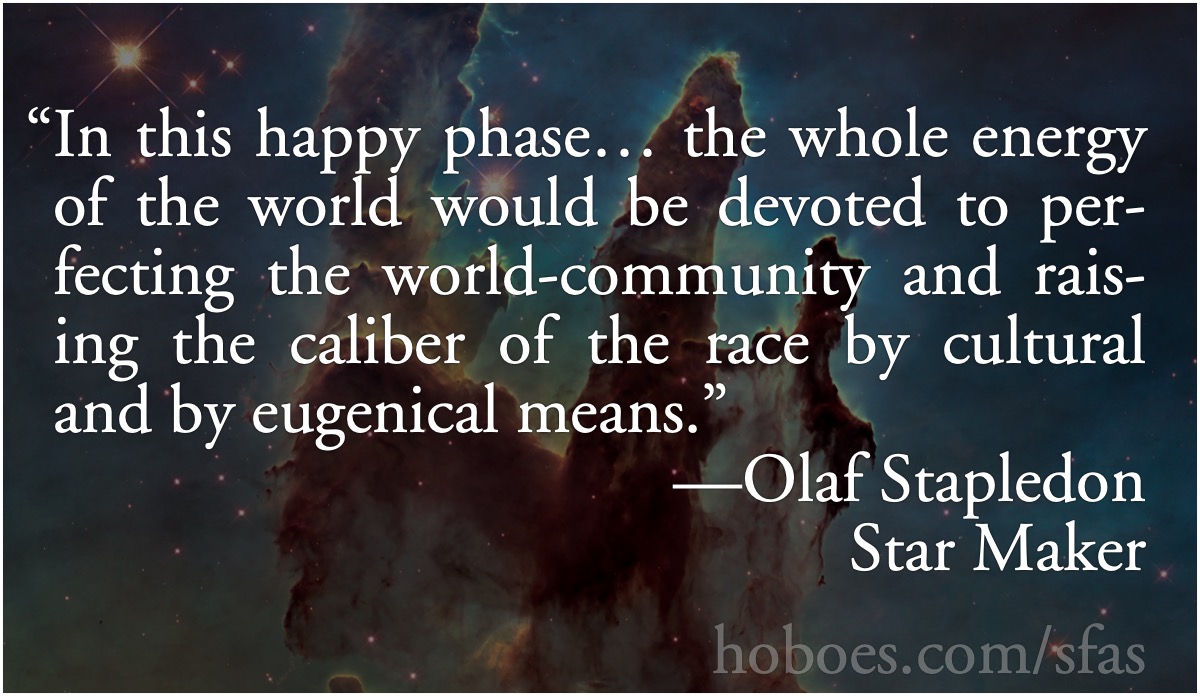 Stapledon published Star Maker in 1937. Giving him the benefit of the doubt, he should have known better. More likely, he probably knew exactly how these “enlightened” dictatorships were being used elsewhere in the world.