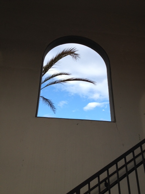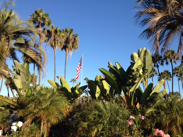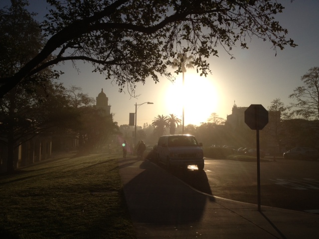 Is there anything more iconically San Diego than an adobe structure with palm trees and a blue sky beyond it? We’re a Caribbean island in the middle of the California Ocean. There’s a tidal wave out there threatening to engulf us; yesterday was wet, grey, and wet. Today there are storm clouds over the ocean but the eastern sky is fluff.