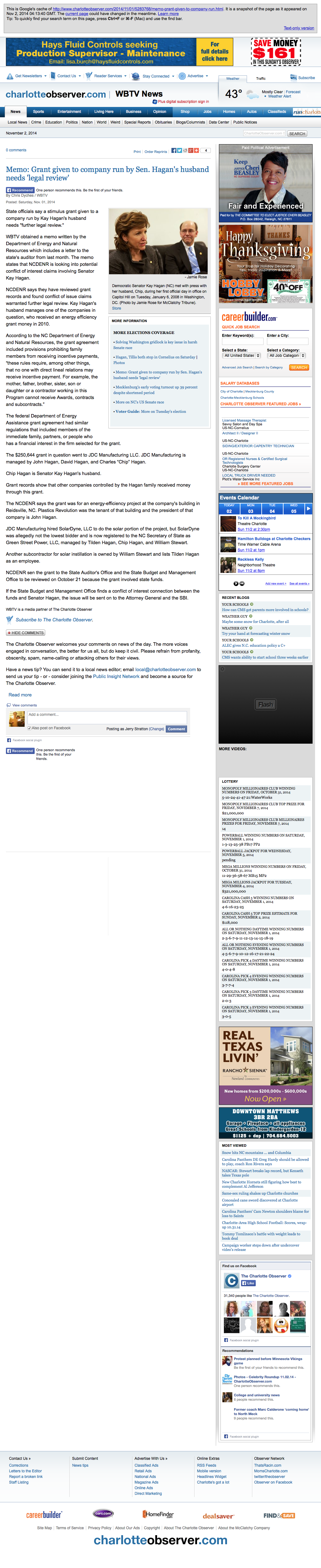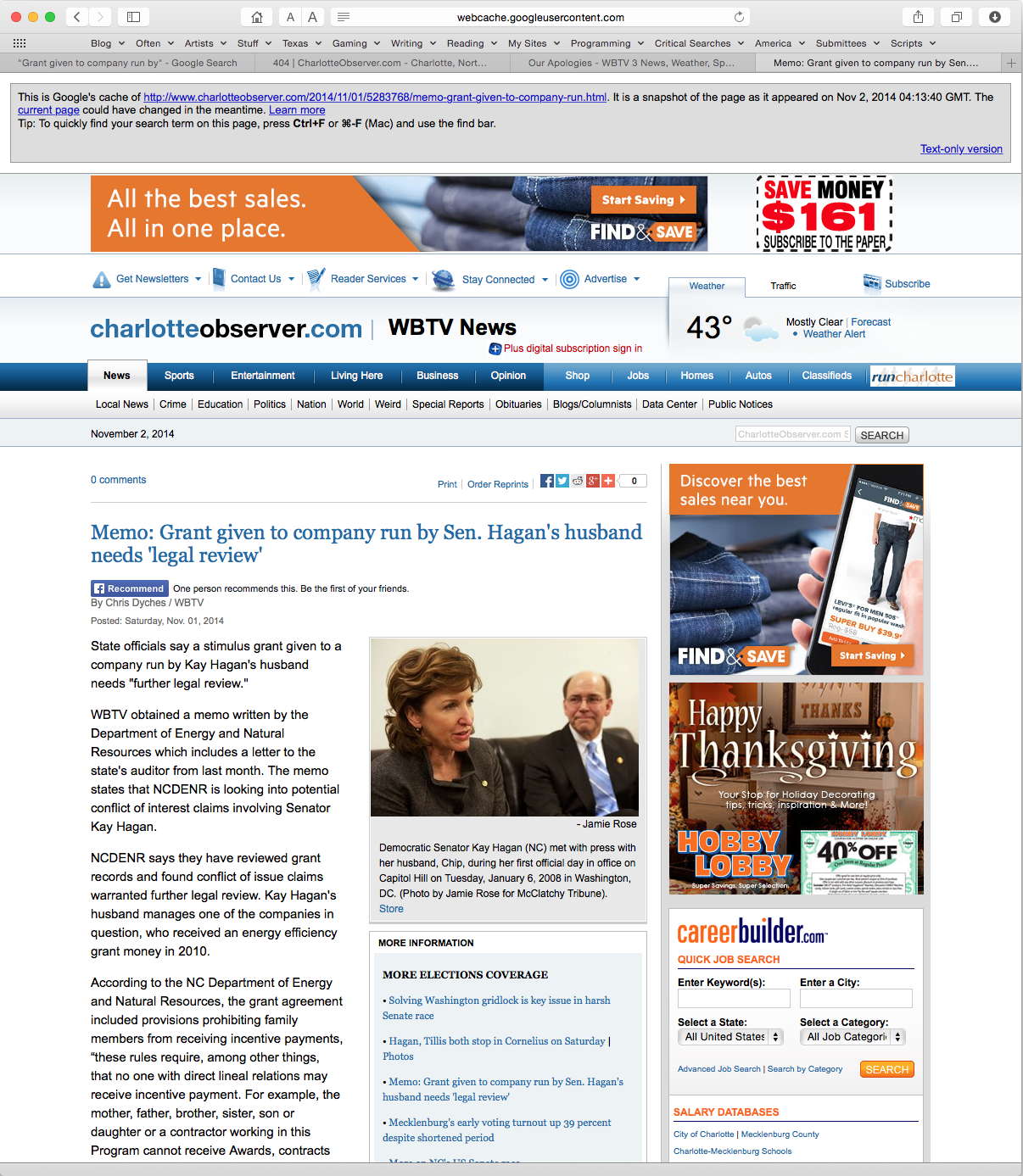 - The full Charlotte Observer article on the deleted Senator Hagan grant scandal, from Google’s cache.