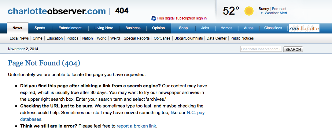 But, again, it just links through to the Charlotte Observer’s 404 page.