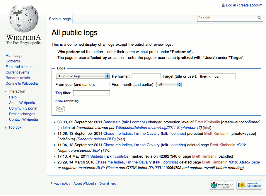 - “But one of the most concerning aspects of this reputation maintenance campaign is the way history is rewritten. And one example of that is the way that Kimberlin’s Wikipedia entry was whisked away from view on September 14, 2011.” (Memeorandum thread)
