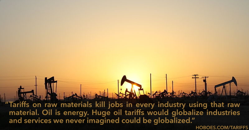 Steel tariffs were crazy because steel goes into a lot of manufacturing, and so we lost a lot of manufacturing jobs. Oil tariffs are infinitely crazier. Oil is energy. Energy goes into literally everything we make and everything we do. Energy goes into manufacturing, it goes into transportation, it goes into services—even purely service-oriented industries still have to keep the lights on and the computers running. Oil tariffs that double or triple the cost of oil, as Stelzer suggests, would put every business in the United States at a major disadvantage compared to the rest of the world.
