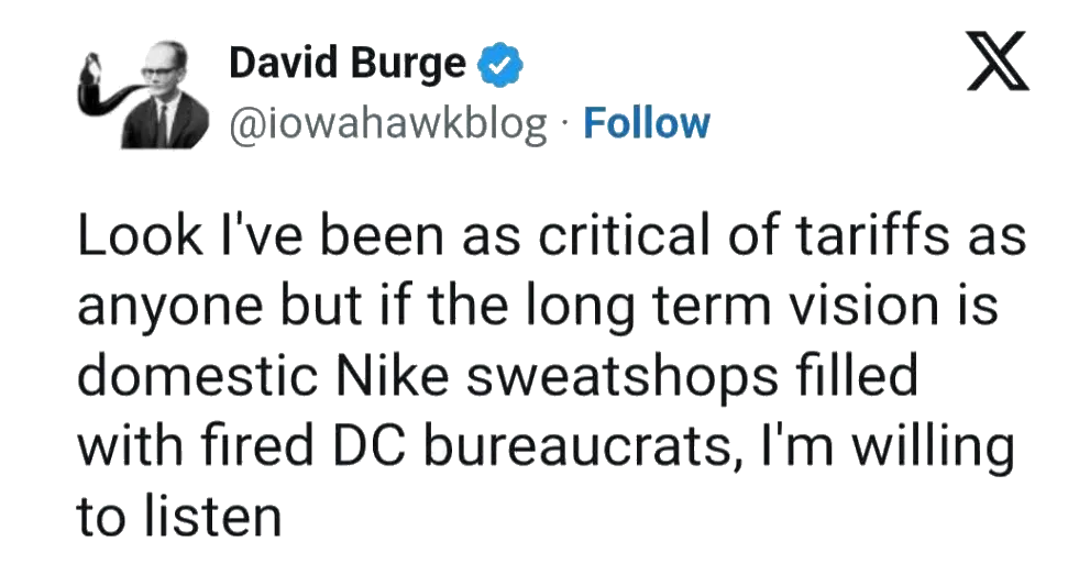 - “Watching the Trump’s Tariff War from afar, I find it hilarious. He has managed in the past week to get the world to accept a 10% tariff on everything while triggering Red China to engage in an actual tariff war that is financially suicidal for the communist regime.”