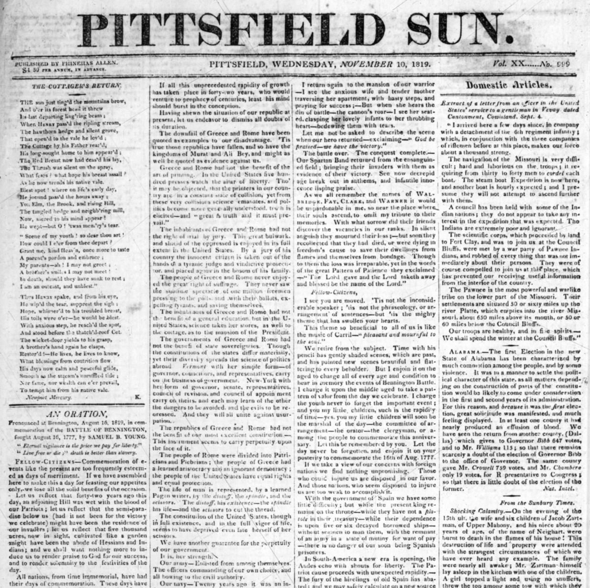 While researching the origin of The Rifleman’s Song of Bennington I ran across this 1819 speech on the occasion of the Battle of Bennington. It appeared in The Pittsfield Sun of Pittsfield, Massachusetts, November 10, 1819 and was given by Samuel B. Young on August 16 of the same year.