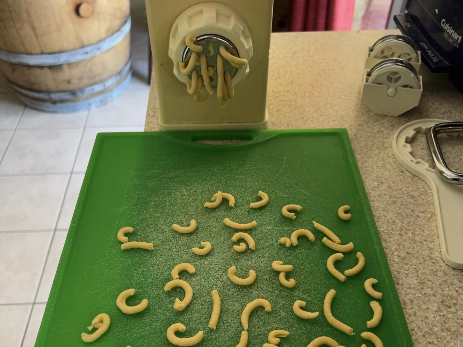 It’s basically a macaroni salad. The recipe calls for elbow macaroni; that’s pretty much what I used. One serving of homemade pasta made just enough macaroni for the recipe, and macaroni from an Atlas macaroni extruder pretty much automatically elbows.