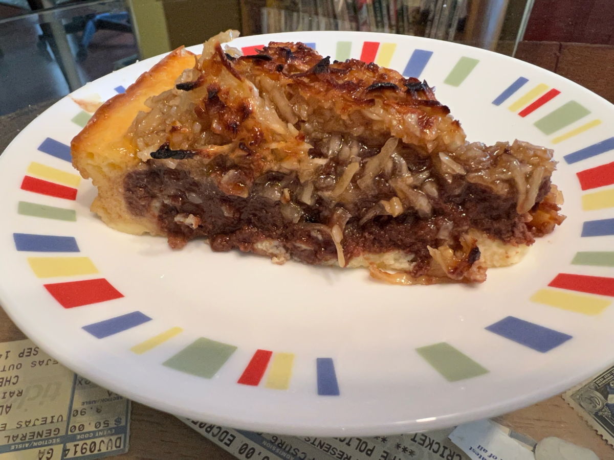 When I made it, because I wanted to try out multiple recipes in this book, I did not garnish with non-dairy whipped topping and chocolate shavings as the recipe calls for. Instead, I used the Broil-On Coconut Topping on the facing page of the pamphlet. Coconut and cheesecake is a great combination, and this topping rounds out the “three from” this pamphlet.