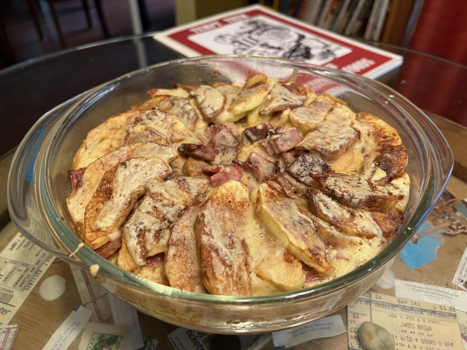 That really is a pancake batter, and poured over the top of ham and apples it seeps into the mix to provide texture while only leaving a barely discernible thin crust over the top layer of apples to brown. This is very different from other “New England Ham and Apple” breakfast pies which typically call for “pastry for a 2-crust pie” and put the pastry on the bottom and top.