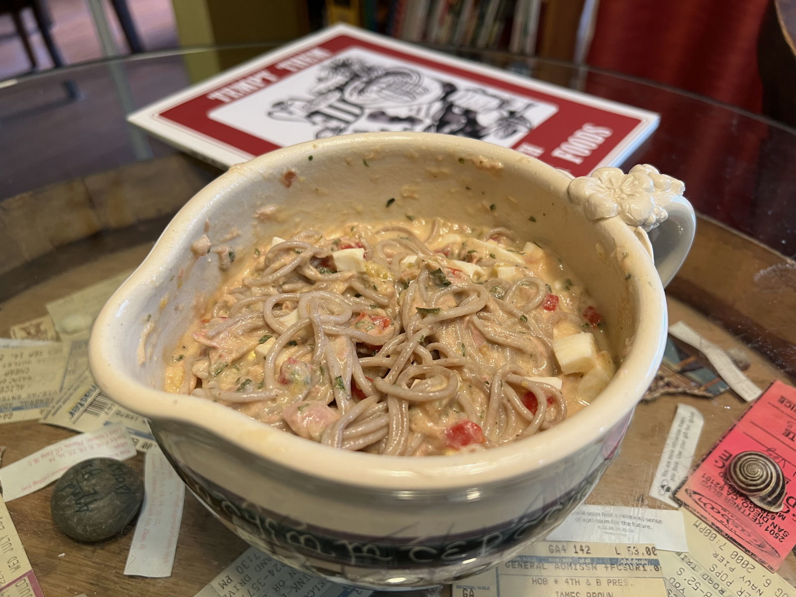 For something that is both a little different from what I normally make, and a lot like what I used to see at potlucks and holiday gatherings, I made his Lenten Salad for a Friday during Lent. It calls for elbow macaroni; I used soba noodles. It makes for a far less photogenic dish, but it tasted good.