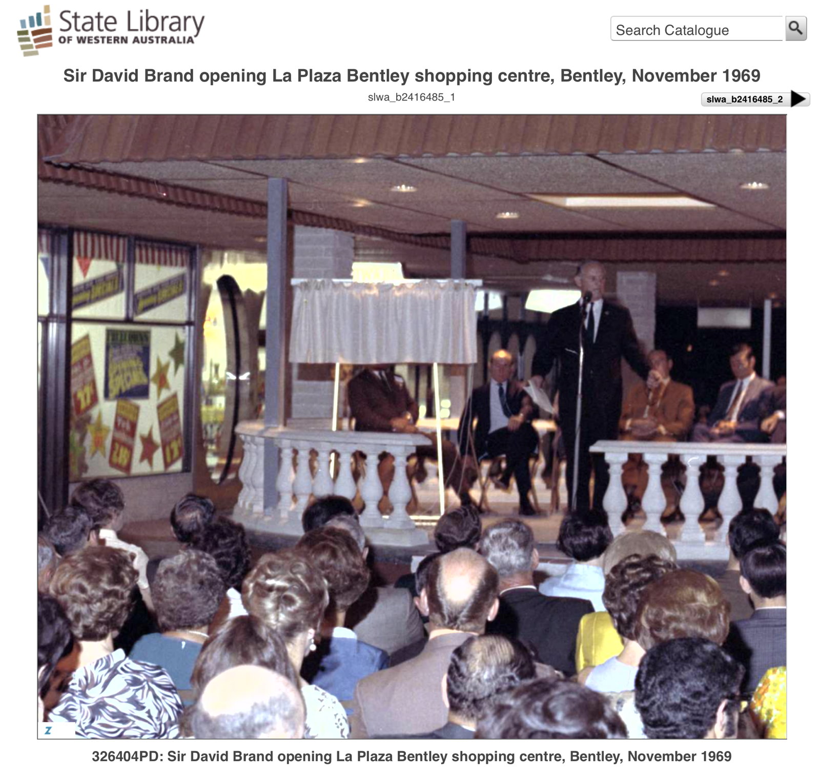 Businesses advertising in The Royal Australian Air Force Women’s Association’s Jet Age Cookbook included businesses with addresses in the La Plaza Bentley Shopping Centre. The State Library of Western Australia has many photos from the Plaza’s November, 1969, opening.