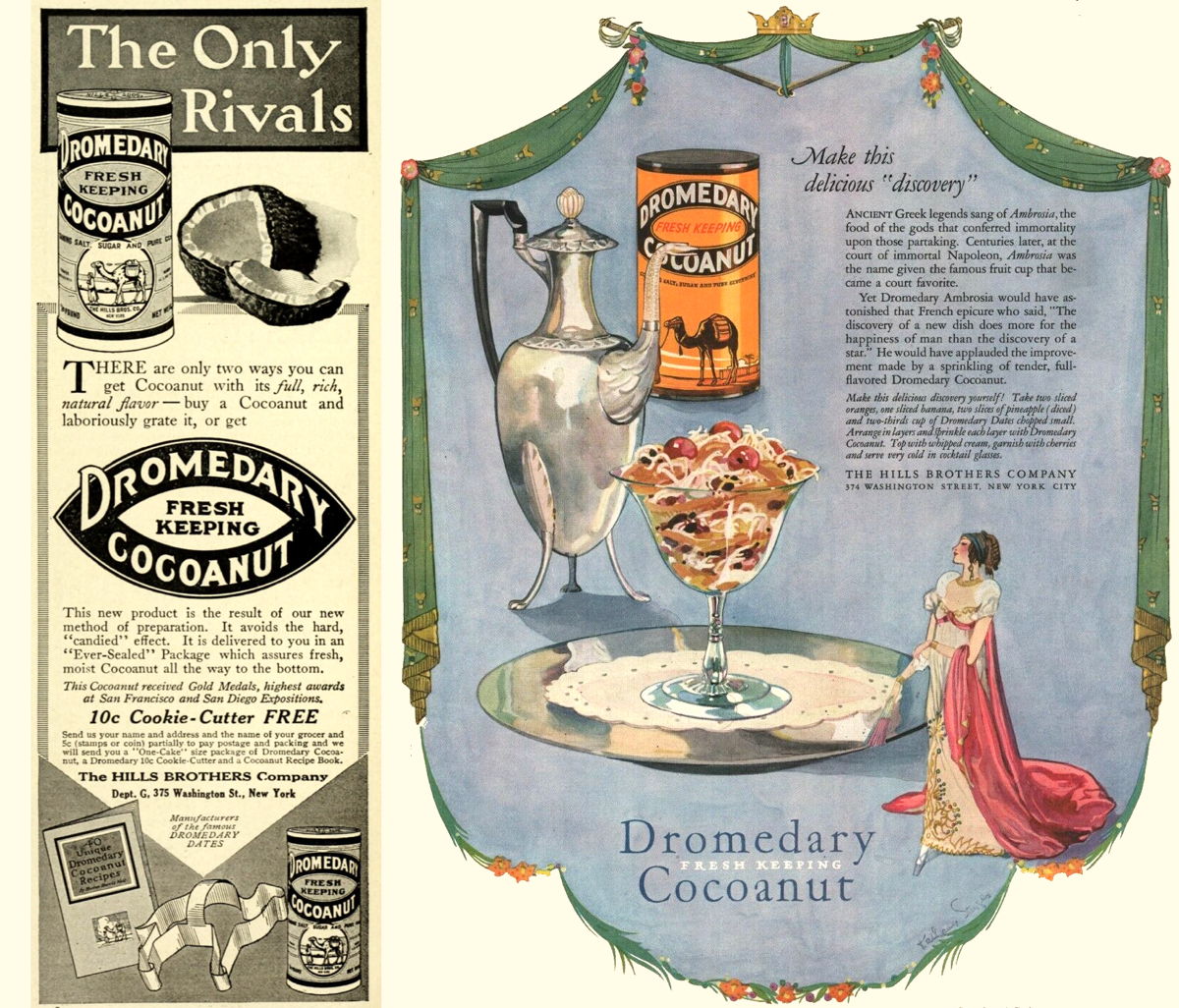 Dromedary, whose pamphlets are almost universally wonderful, changed the design of their coconut can around 1925 after using the same design since at least 1915. Their ads changed at the same time to reflect the new design.