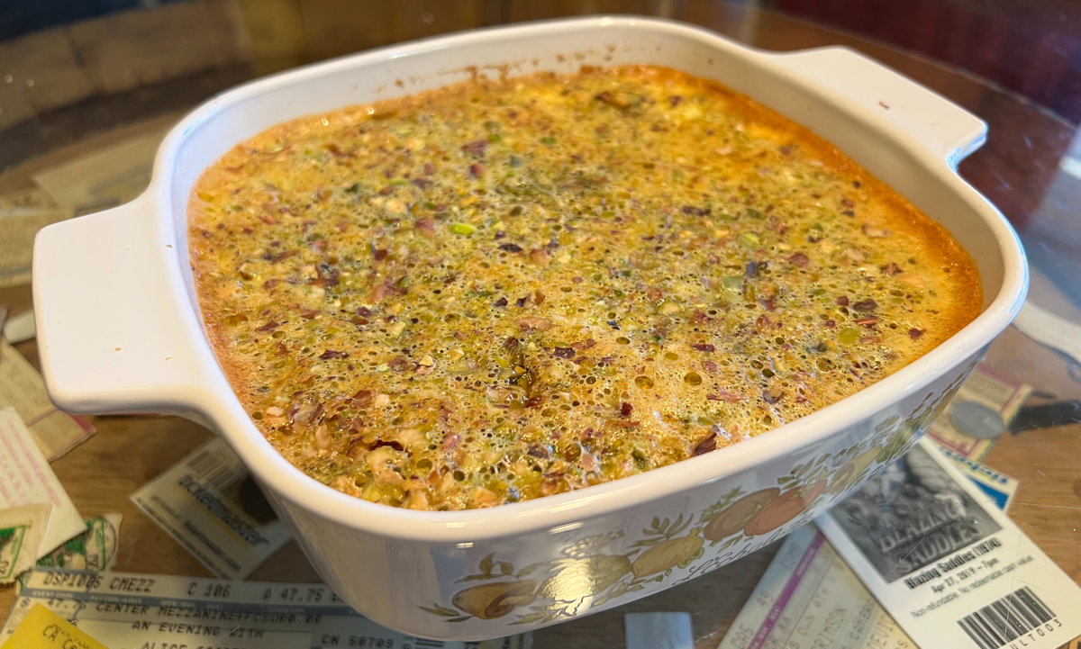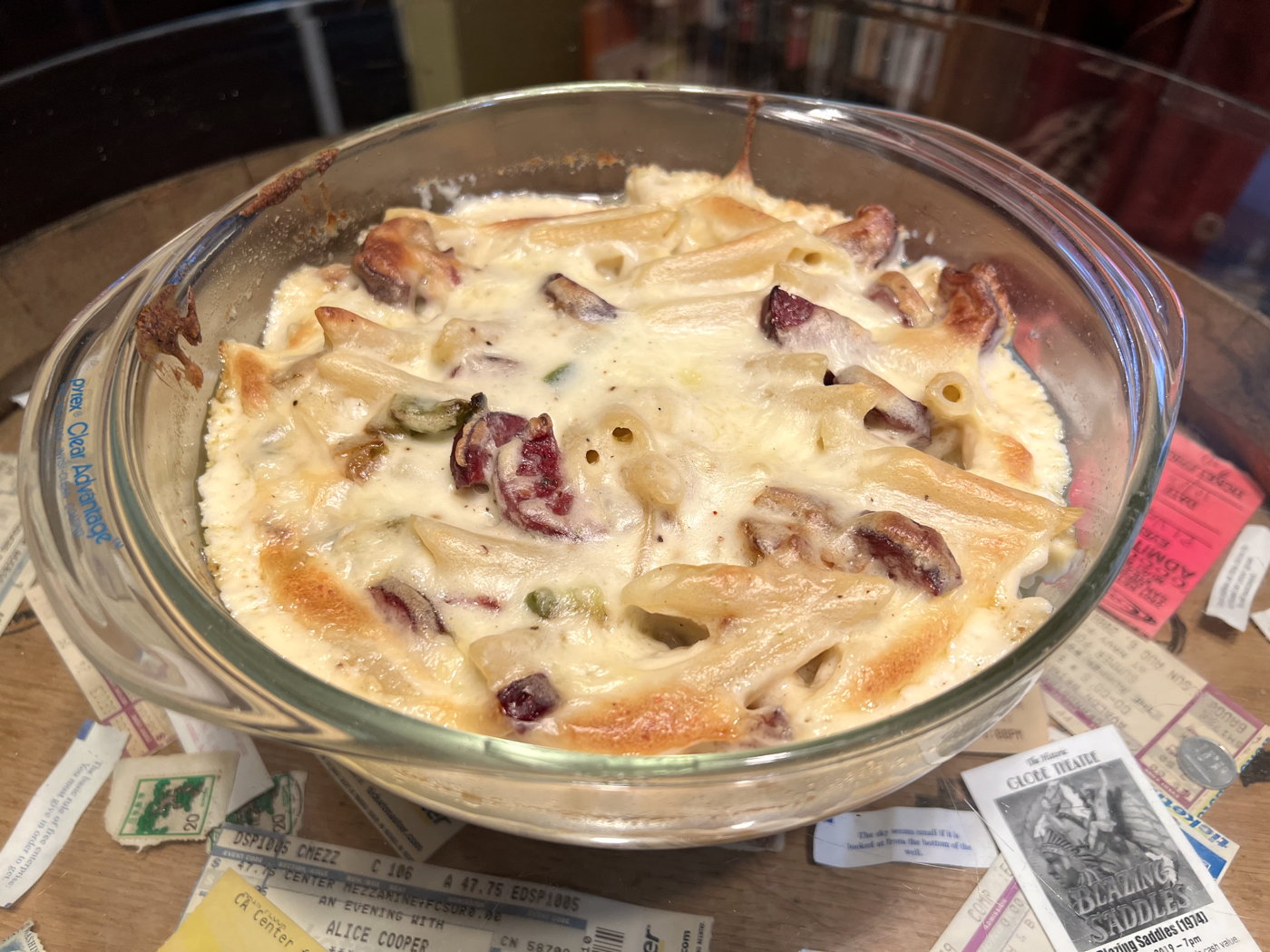 While most of my great food memories involve dessert, some of them involve macaroni and cheese. Mom’s Baked Macaroni and Cheese is also easily adapted to what’s on hand. It calls for “medium or sharp cheese”. I had a bunch of my favorite garlic cheese spread made up—cream cheese and cheddar—so that’s what I used. A friend had just given me a box of game, including some venison and wild boar sausage with jalapeño and cheese, so I used that. And I had a leftover half of an onion and half of a jalapeño in the fridge, so I fried them just enough to get a little browning going, and used that, too. All of the ingredients that go in should be already cooked; the baking is merely to get a good bubbling going and a touch of browning on top.
