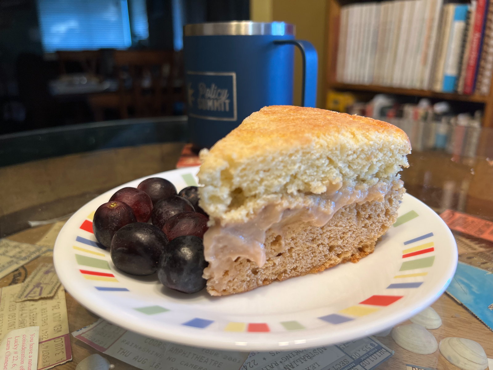 I have rarely had luck with recipes that instruct you to put the dish into a pan of hot water while baking. After having made mom’s Baked Custard I think I’ve been using too much water in the outer dish. The custard was definitely not done after 45 minutes despite being only a one-third recipe. I upped the temperature to 400° and let it go another 15 minutes. It turned out perfectly, even to the point of both quivering when pressed and a knife coming out clean. I’ve since experimented, and less water does indeed work a lot better. I rarely bring the water up to more than a quarter inch now. It’s usually practically gone when the baking is done.