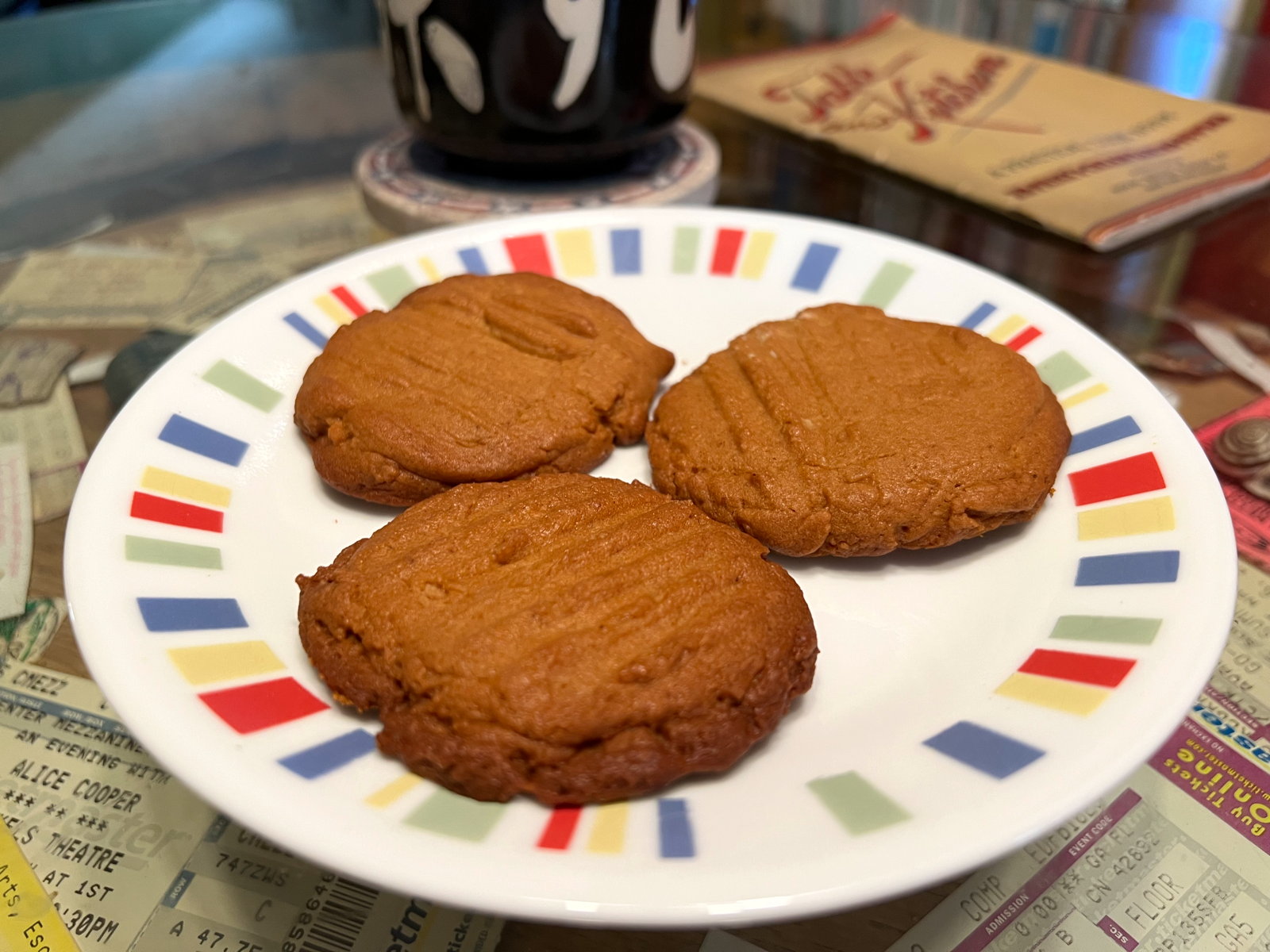 They’re made by boiling molasses to a candy stage and then adding butter to melt. For the dry ingredients, I used 1 cup flour mixed with the ginger and baking powder. I then added another three cups to bring it to a smooth batter. I have a suspicion the recipe assumes that a little salt will be added, too. I’ll make it with ¼ teaspoon salt next time. I might also try to make it with slightly less or even a lot less flour—2 cups to 2-½ cups extra instead of three cups extra.