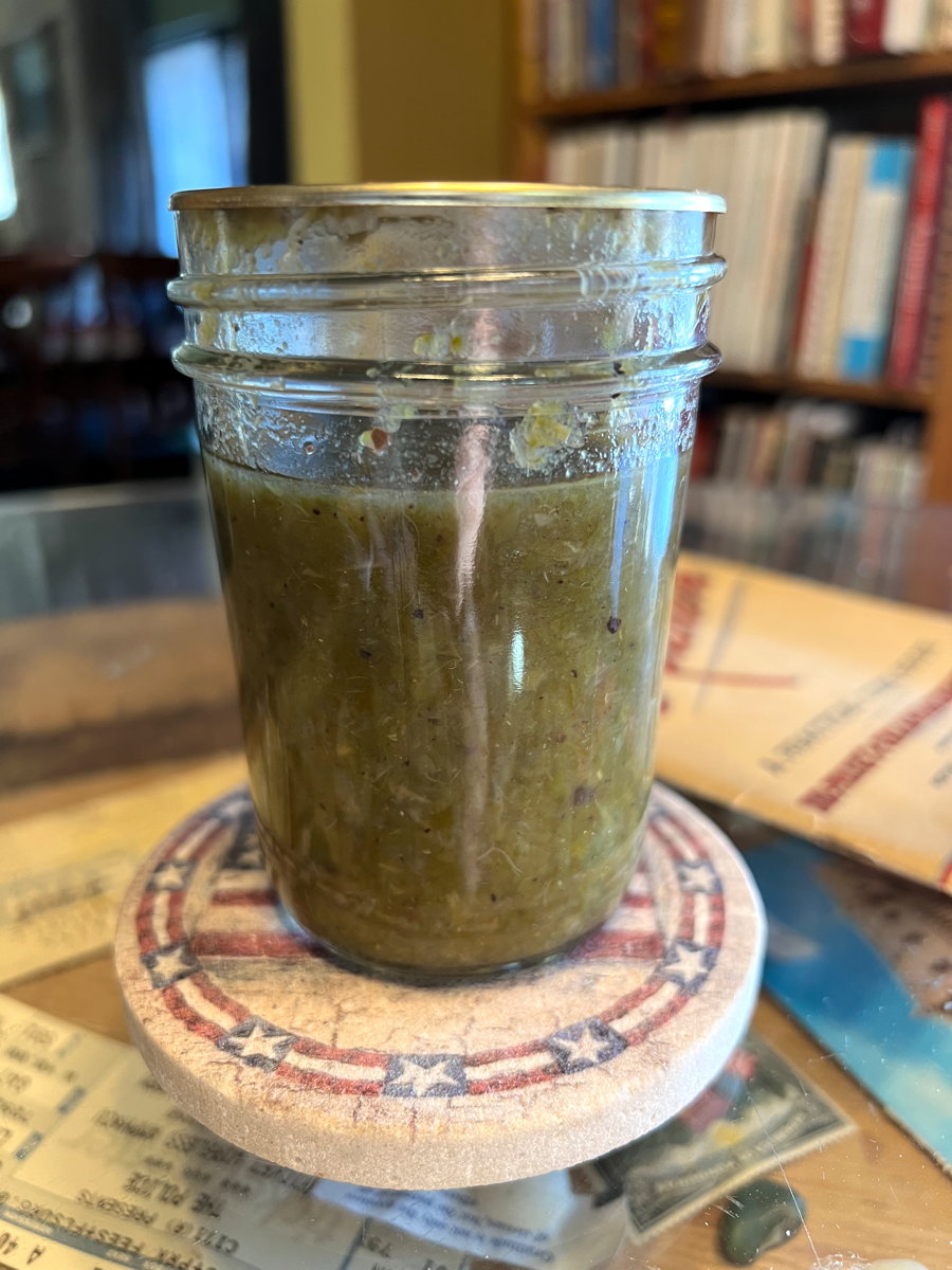 The Green Pepper Catsup was the first, and wow! It’s very simple. Green peppers (“the hot variety”); cloves, allspice, and mace; onions; and vinegar. The amounts are horribly vague. How many green peppers fit in a “kettle of ten pounds capacity”? Does that mean four and a half quarts? I.e., ten pounds water? Google’s AI seems to think that a ten-pound capacity kettle is a piece of exercise equipment, and I guess making a full recipe of this would indeed be serious exercise!