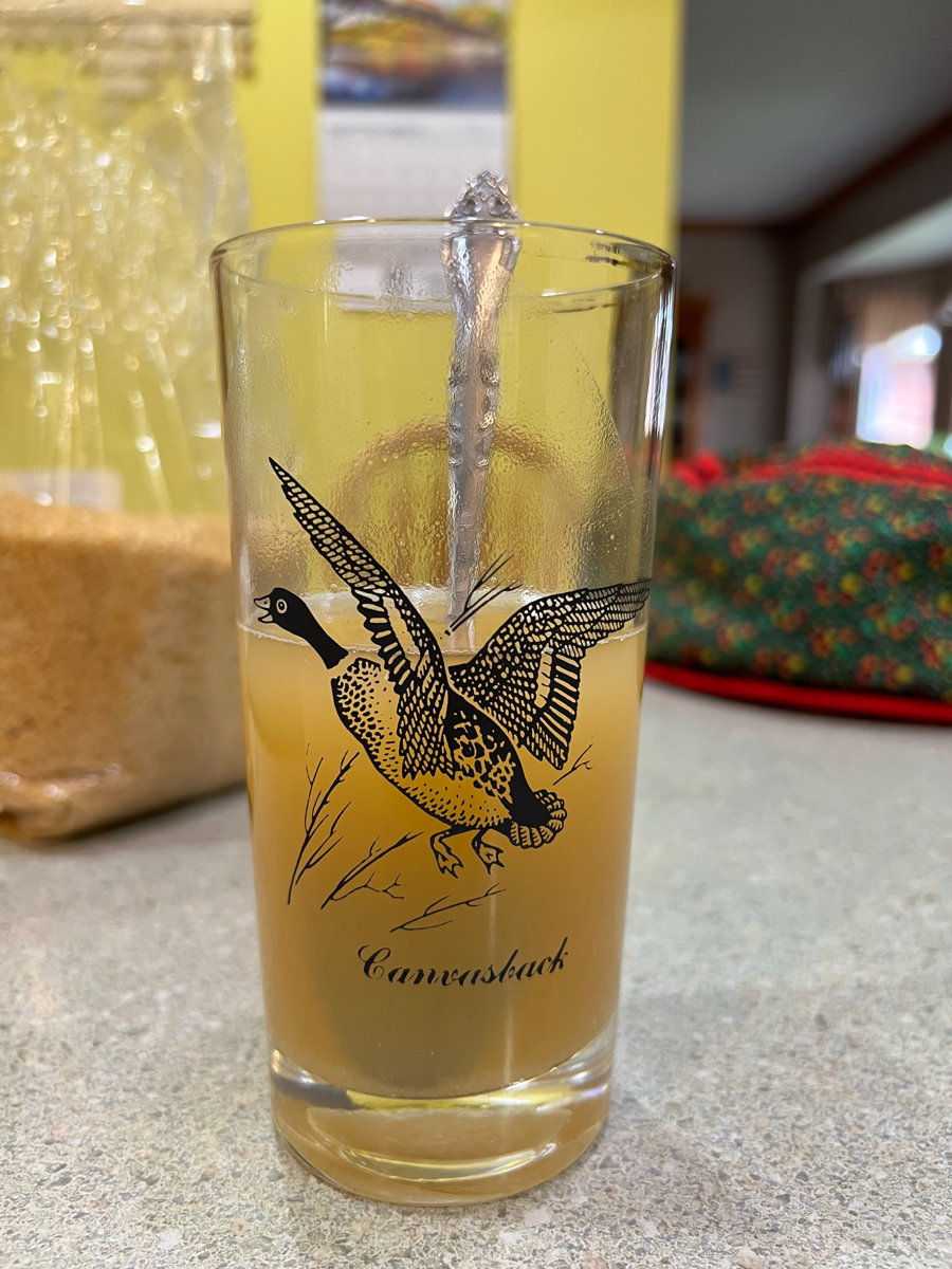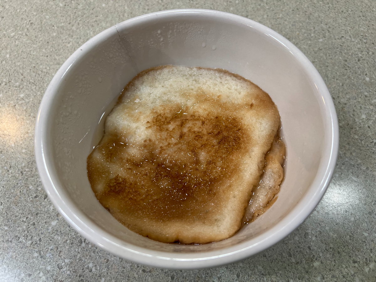 I decided that writing this post was a good time to try Toast Water. The recipe doesn’t say anything about how much toast to use, other than using the plural, and is moderately vague about how much water. I used two slices of toast, and probably a couple of cups of boiling water to cover. I should, I think, have used at least another cup. The bread soaked most of the water up, and even pressing the toast over the sieve left a lot of water in the toast.
