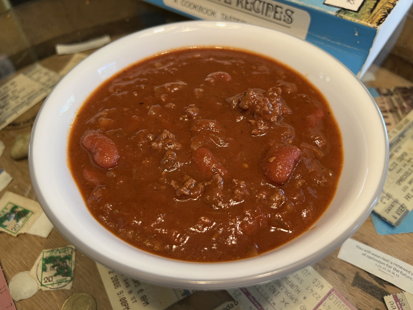 While traveling in Michigan I picked up a tome, a 1980 collection of Favorite Recipes “from active and retired Michigan Bell employees and friends”. This thing is giant, which is to be expected since its community technically covers the entire state. It’s filled with great Michigan recipes, but my favorite has to be the Chili. It’s made with unsweetened chocolate, and while the recipe calls for the bar kind, I discovered that using powdered makes for a remarkably thick and smoky chili.