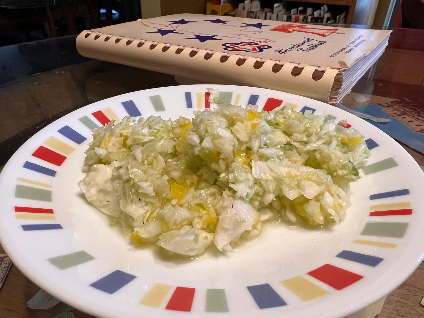 I made a couple of cabbage recipes from it. My now-favorite Cole Slaw comes from this book: no mayonnaise, just sugar and vinegar and a few spices. And a cooked Cabbage in Cheese Sauce that’s pure comfort food, straight out of the seventies.