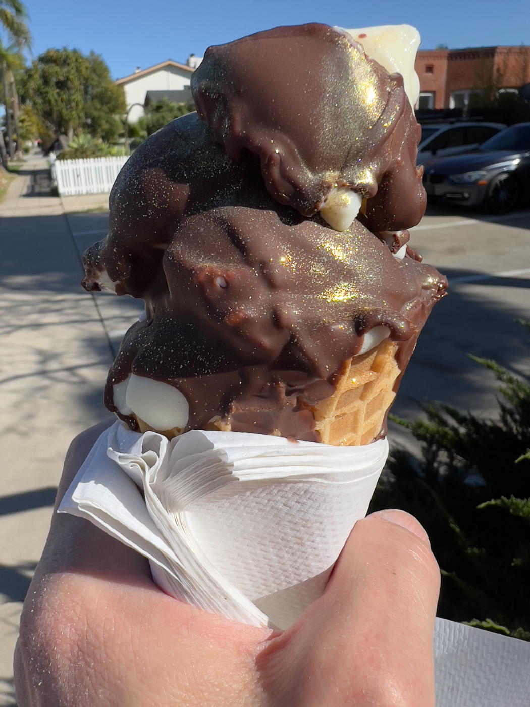 In February, I went to San Diego. The highlight of the trip was a wonderful meal at Bistro du Marché in La Jolla, and the dish that made the meal was their lobster bisque. But I also walked all over the city and was pleasantly surprised to find an upscale ice cream shop at the end of one long walk on a warm day, Eclipse Chocolate, and their gold-flecked chocolate-dipped ice cream cones.