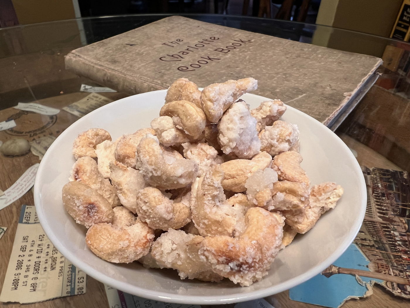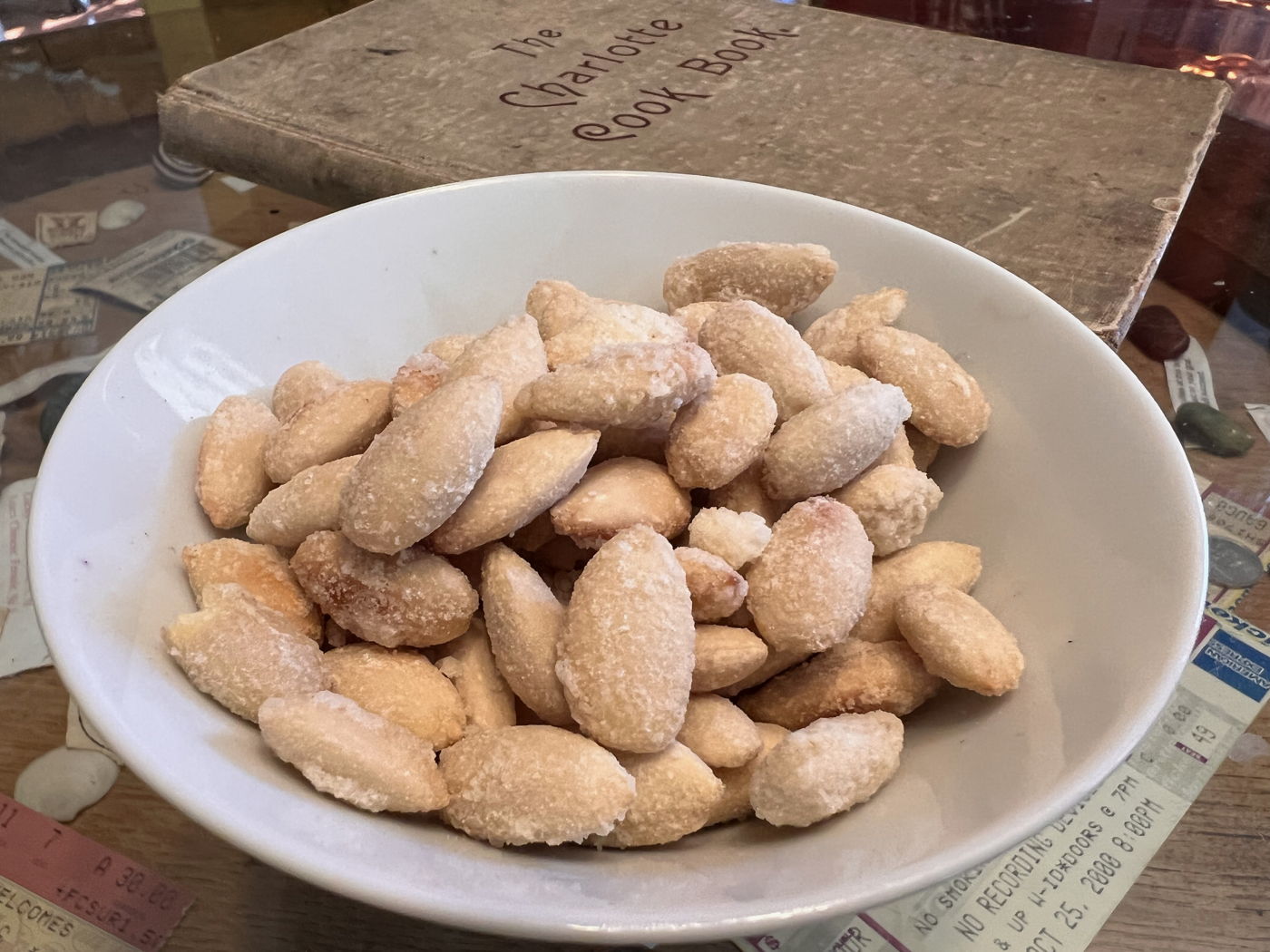 Those aren’t the only Michigan recipes I tried this year. I acquired a fascinating 1893 cookbook, The Charlotte Cook Book, which, I have recently been informed, is pronounced CharLOTTE, making Charlotte Michigan entirely different from Charlotte North Carolina. Besides all sorts of recipes for salad dressings that last in the heat without refrigeration, there was an odd recipe for Grilled Almonds.