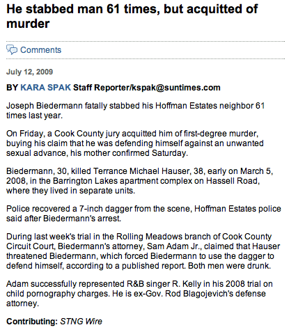 - “On Friday, a Cook County jury acquitted him of first-degree murder, buying his claim that he was defending himself against an unwanted sexual advance, his mother confirmed Saturday.”