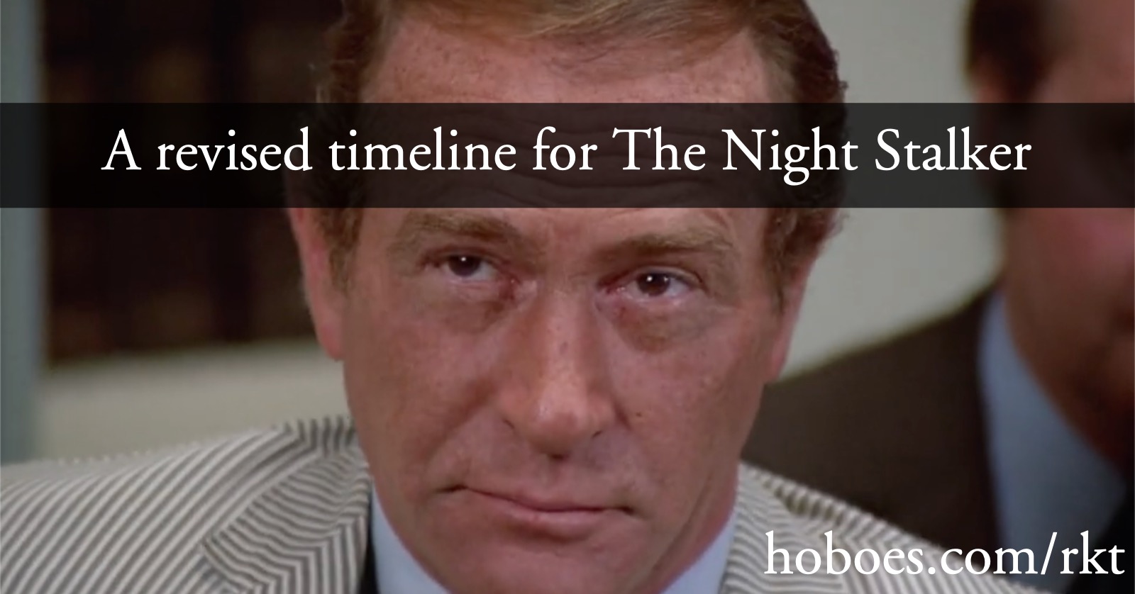 As a side note, Mr. R.I.N.G. was datable to 1972 because it was one of the few episodes that mentioned a weekday along with a month and day of month. Sunday, April 2, pretty much has to be in 1972. This pushes the two movies back to 1965 and 1967 respectively, instead of 1971 and 1972 (or 1973—The Night Strangler is odd) as is generally assumed.