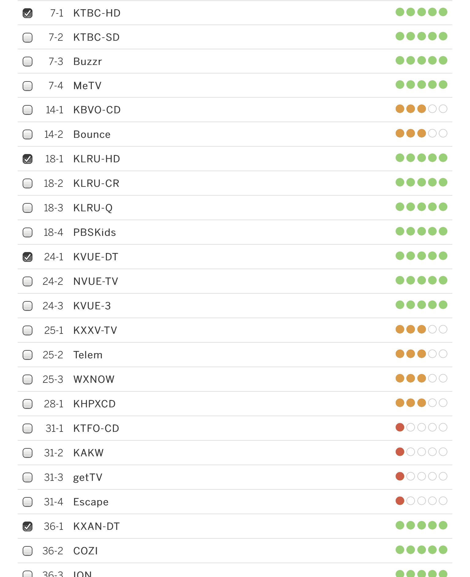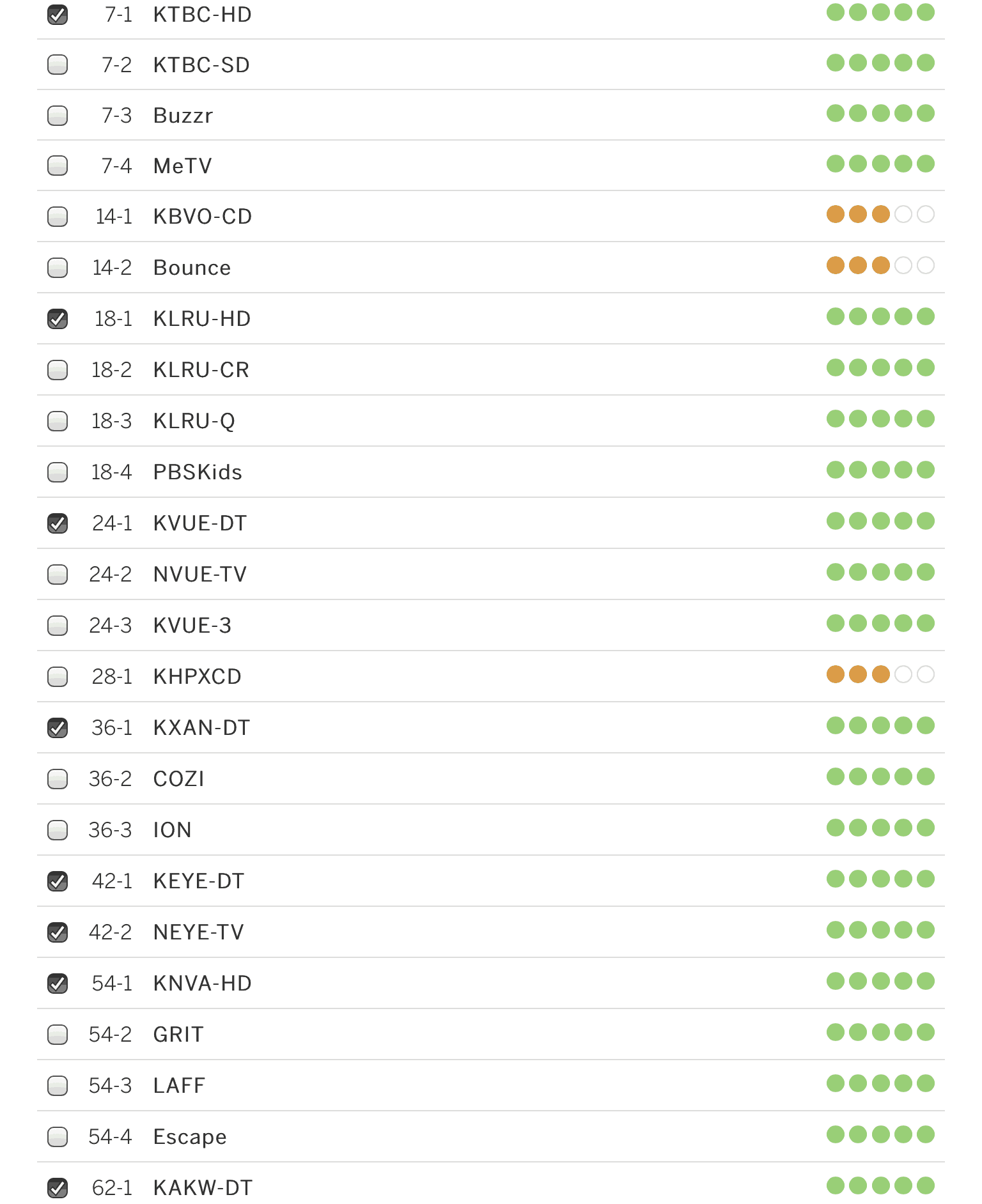 Before the Tablo, I had a Mohu Leaf 50• antenna downstairs plugged directly into the television set. Sometimes it worked better on the window; sometimes it worked better on top of a corner bookshelf at a weird angle. Sometimes it worked better after it fell on the floor, and then later it wouldn’t. When a car drove by, the signal often flickered.2