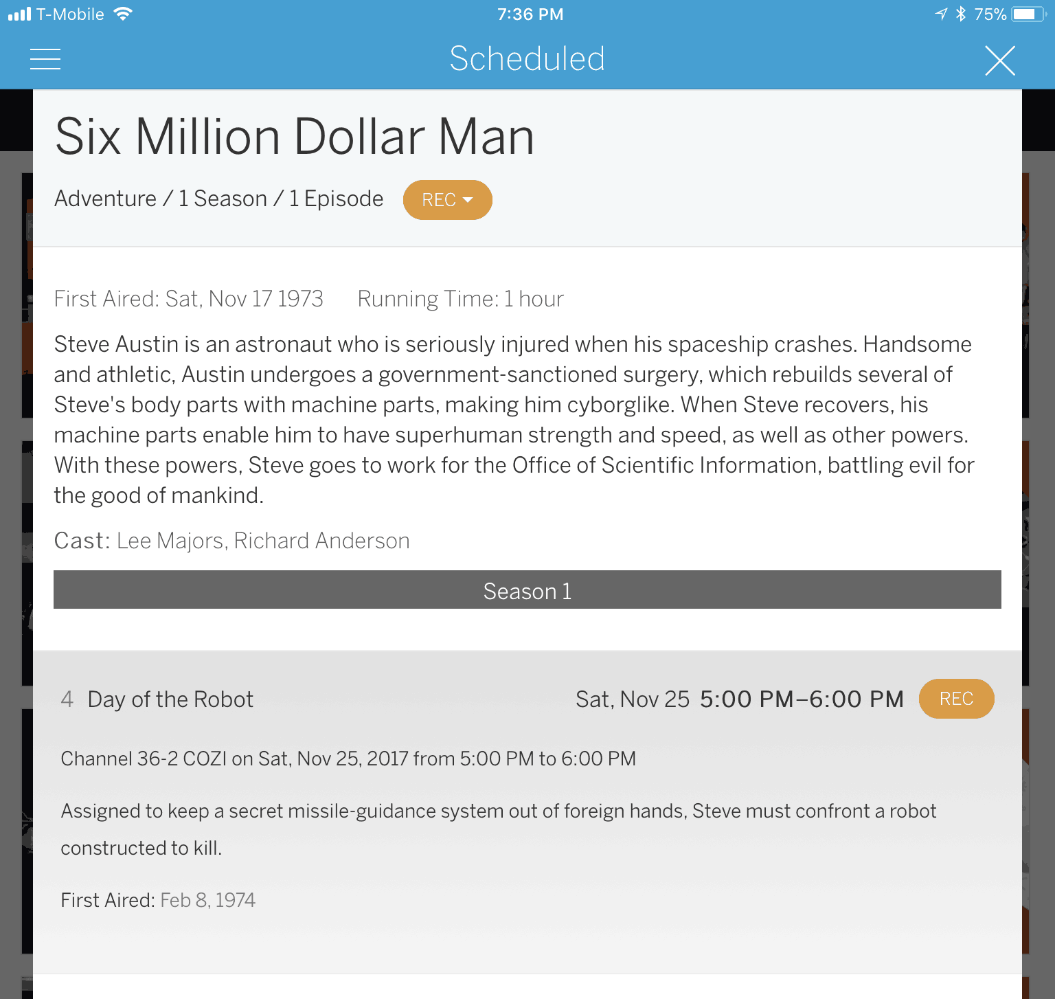 It’s exactly that easy. If it’s a television show, you can mark it to record the whole series. This is how I watched The Orville’s first season, how I’m rewatching The Six Million Dollar Man, and how I’m finally catching The Ghost and Mrs. Muir.