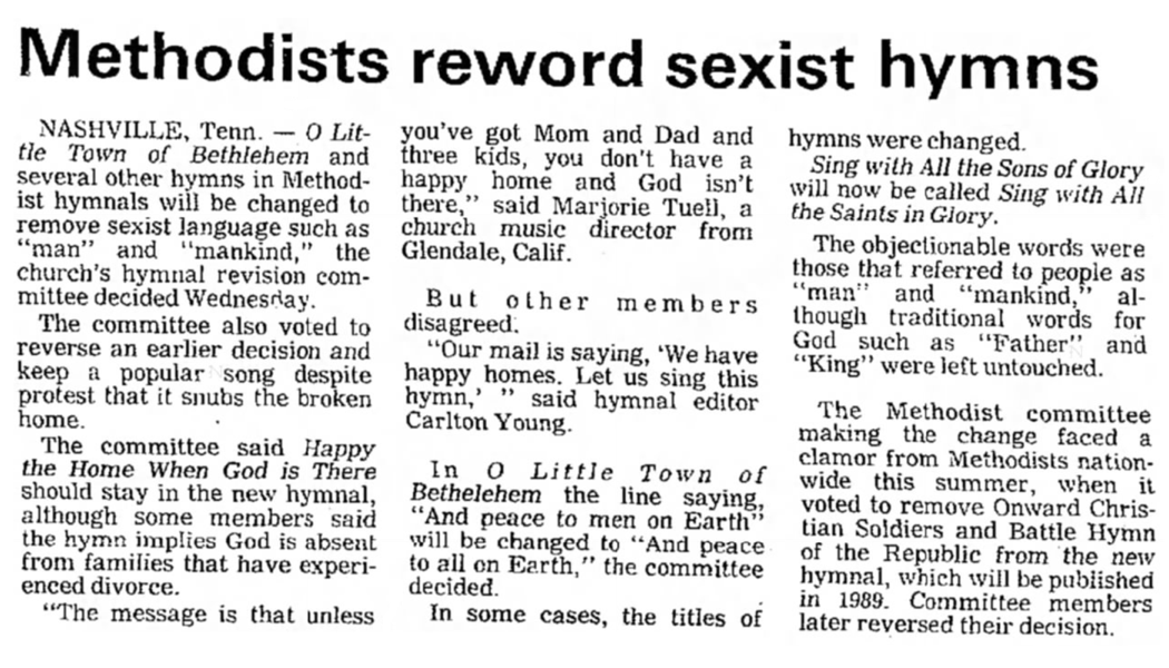 Looking up the new lyrics, I ran across an interesting article from 1986 about Methodists making a new hymnal. O Little Town of Bethlehem fared better than Onward Christian Soldiers and Battle Hymn of the Republic, which were removed completely. Fortunately, actual Methodists complained loudly enough that these powerful—and, in one case, anti-slavery—hymns were restored before publication.