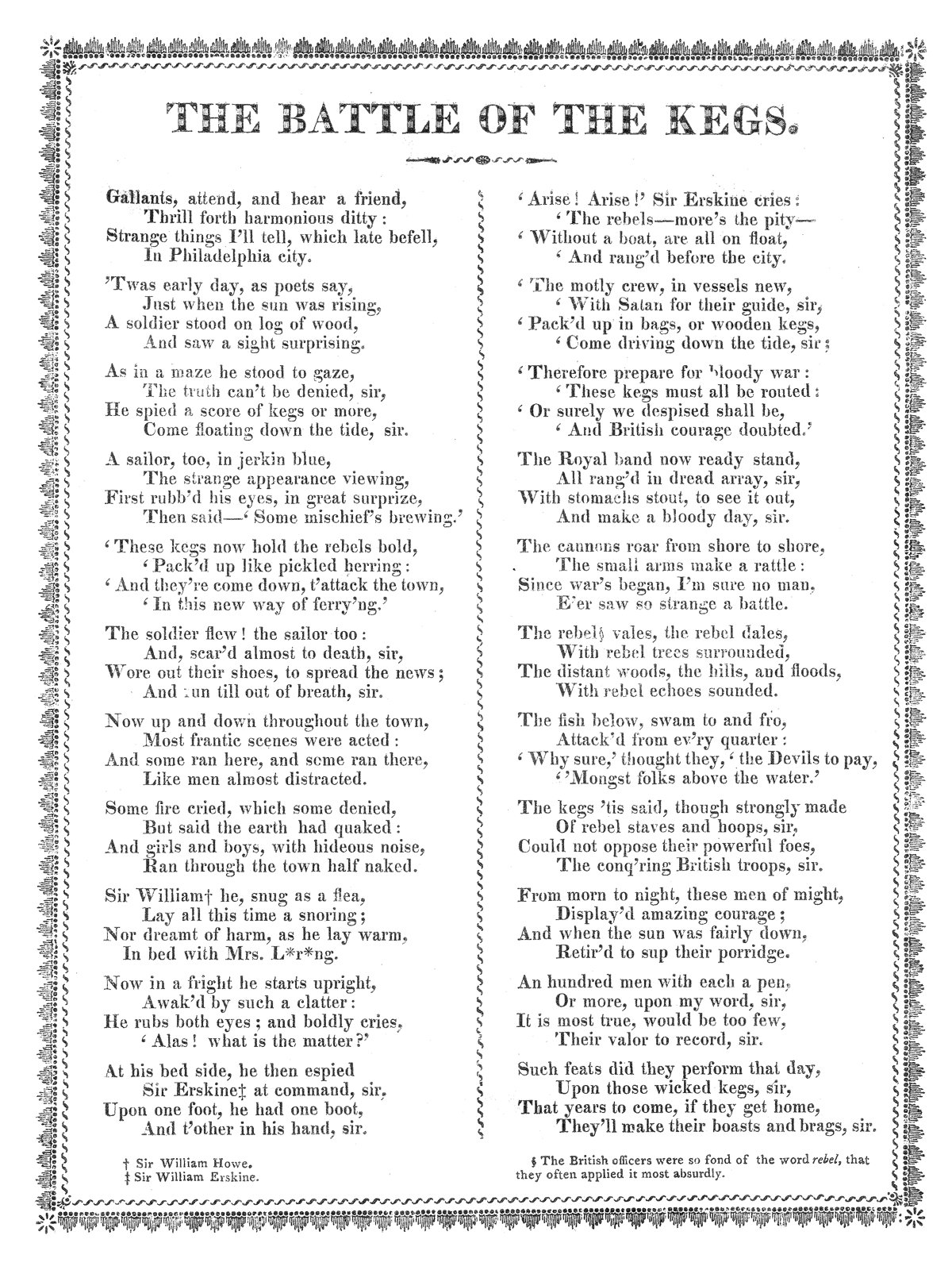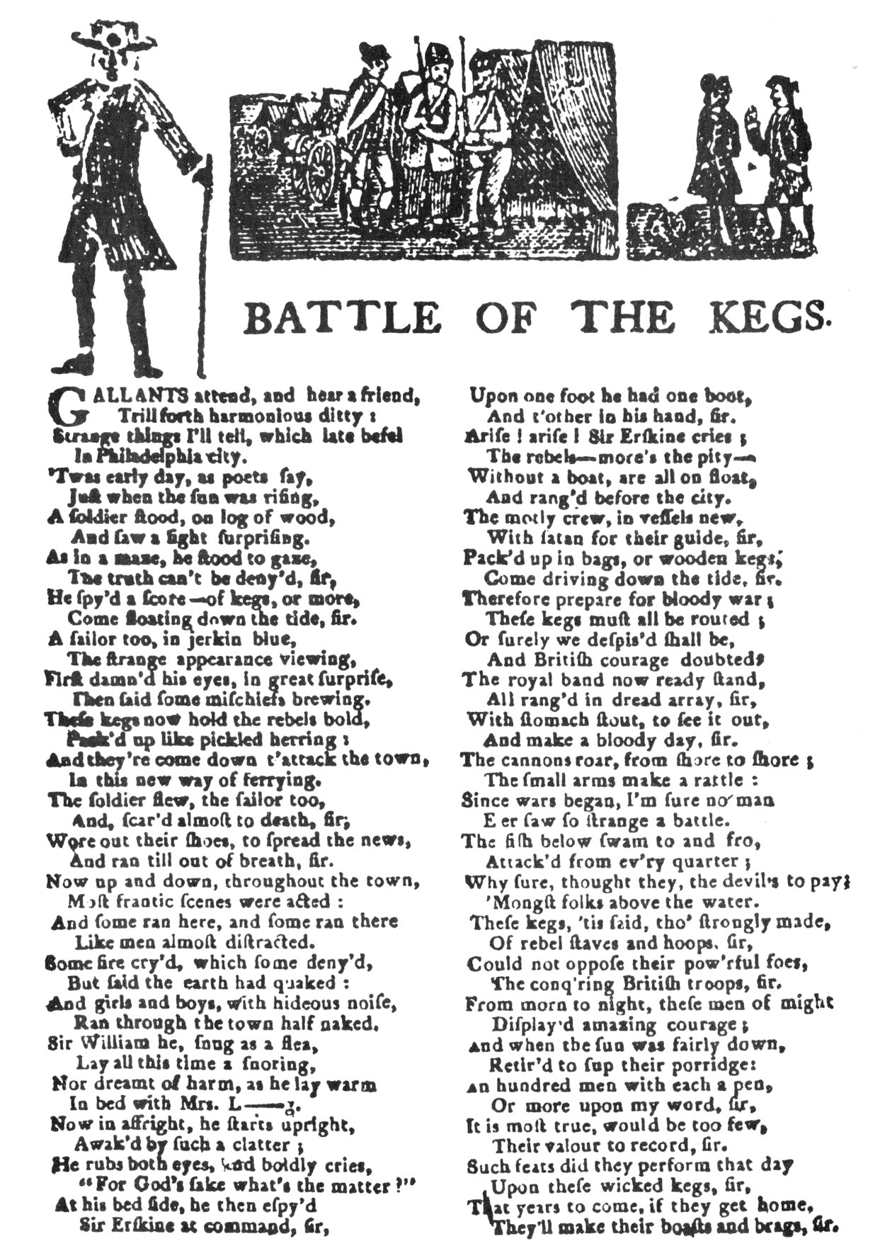- “The Battle of the Kegs was an incident that took place on January 6, 1778, during the American Revolutionary War. It was a failed attempt to bomb British ships by fixing explosives to floating kegs. It is most well-known for inspiring Francis Hopkinson to write a song about, which chastised General William Howe for his affair with a married woman.”