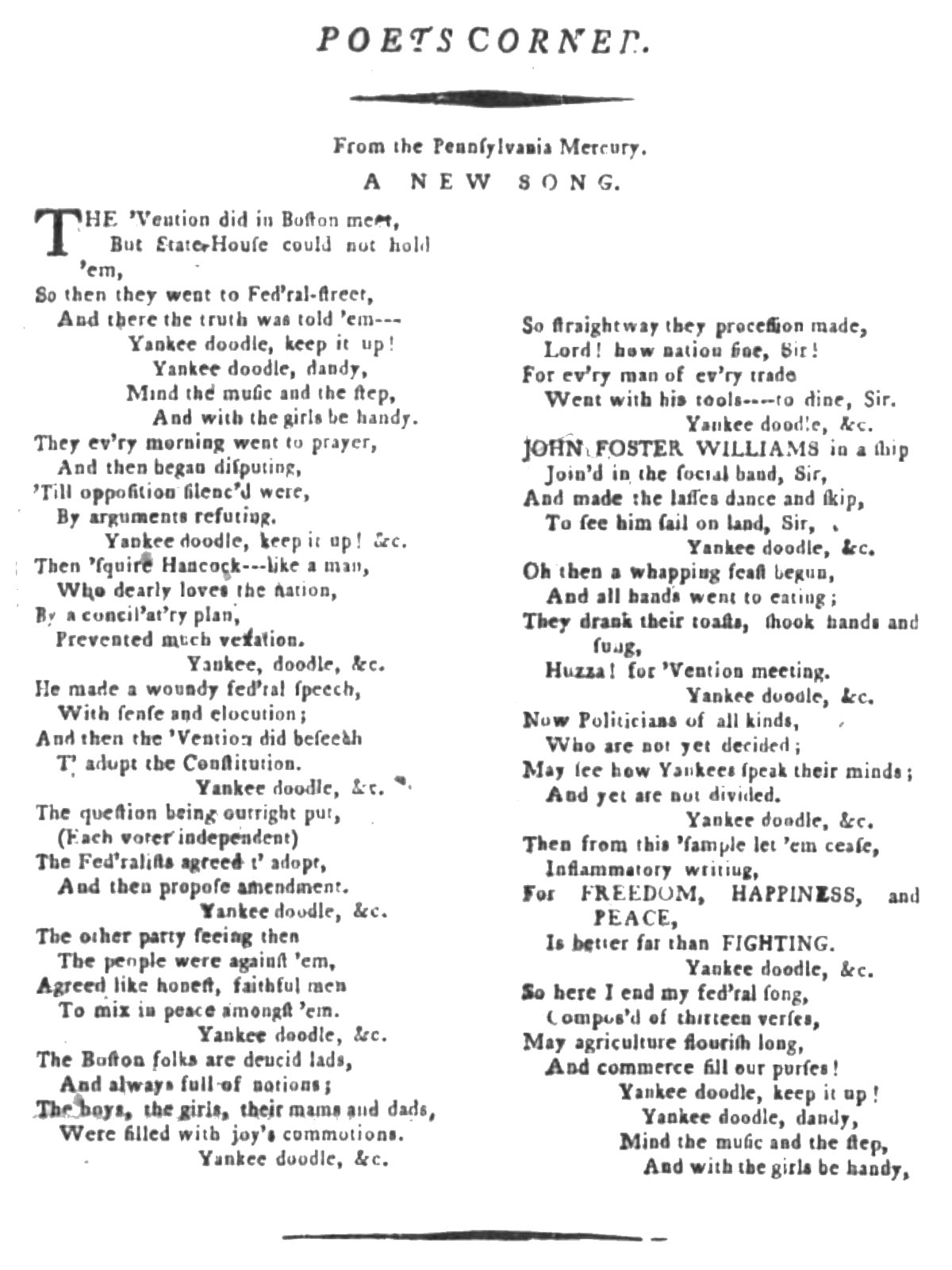Yankee Doodle has inspired many interesting songs from the era. In 1788 “A New Song” was reprinted “From the Pennsylvania Mercury” in several newspapers, even in Canada. It appears to have been part of the campaign for the ratification of our modern Constitution, or possibly praising its ratification in Massachusetts. The “New Song” ends with: