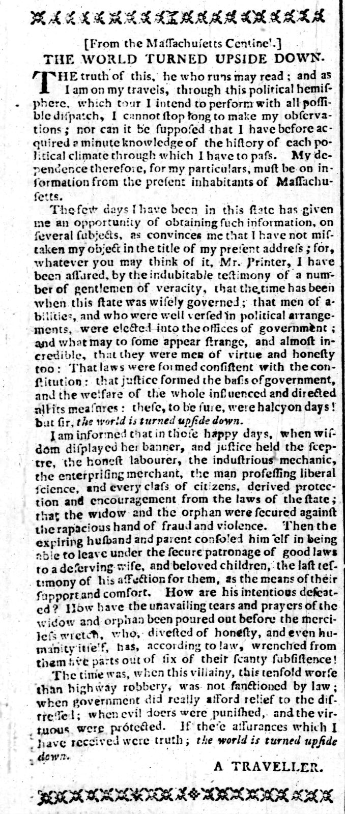 The few days I have been in this state has given me an opportunity of obtaining such information, on several subjects, as convinces me that I have not mistaken my object in the title of my present address; for, whatever you may think of it, Mr. Printer, I have been assured, by the indubitable testimony of a number of gentlemen of veracity, that the time has been when this state was wisely governed; that men of abilities, and who were well versed in political arrangements, were elected into the offices of government; and what may to some appear strange, and almost incredible, that they were men of virtue and honesty too: That laws were formed consistent with the constitution: that justice formed the basis of government, and the welfare of the whole influenced and directed all its measures: these, to be sure, were halcyon days! but sir, the world is turned upside down.