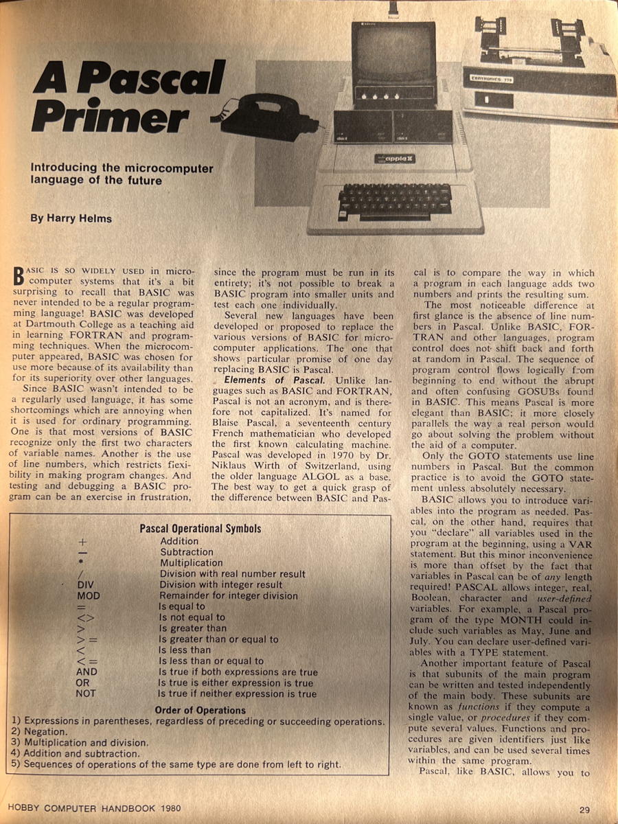The 1980 issue was also where I first heard about the always-about-to-replace-BASIC Pascal language. It fascinated me partly because in the magazine’s samples of the same program in BASIC and in Pascal, the BASIC version appeared to be far easier to read and follow. This was despite the use of indentation in the Pascal version. And BASIC is far from readable.