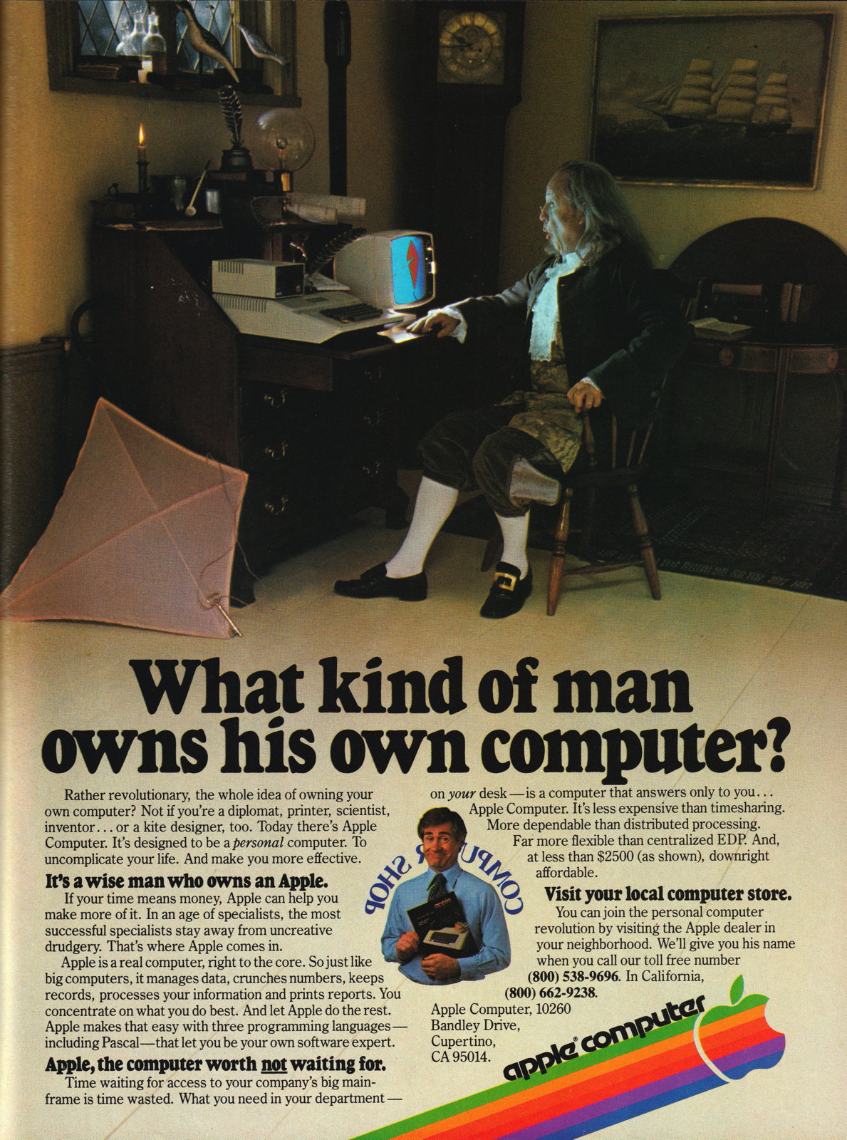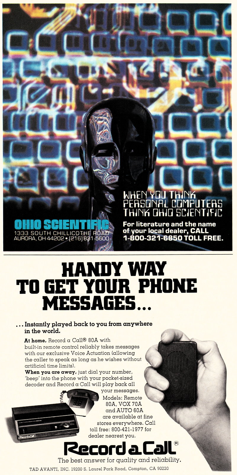 March contained several large personal computer ads. There’s a double-page spread for the Atari 400/800, an ad for the Hewlett Packard HP-85, a Motorola double-spread introducing the MC68000, and a full page Apple ad featuring Ben Franklin. Even Ohio Scientific has a small ad, albeit paired with a generic answering machine.