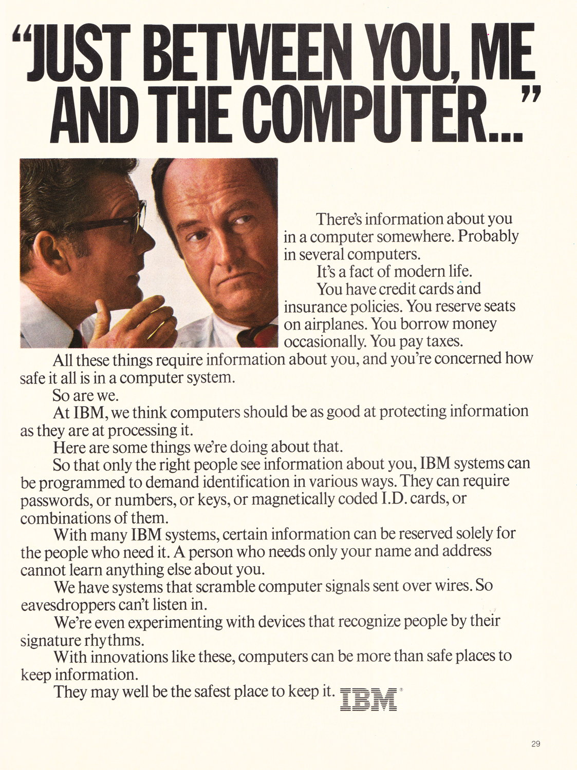 Given Frank Herbert’s tirade in the same issue—reminiscent of Ted Nelson—about how you should own a computer because the government and businesses are using them against you, it’s interesting that the IBM ad focuses on how business data retention is safe for consumers.