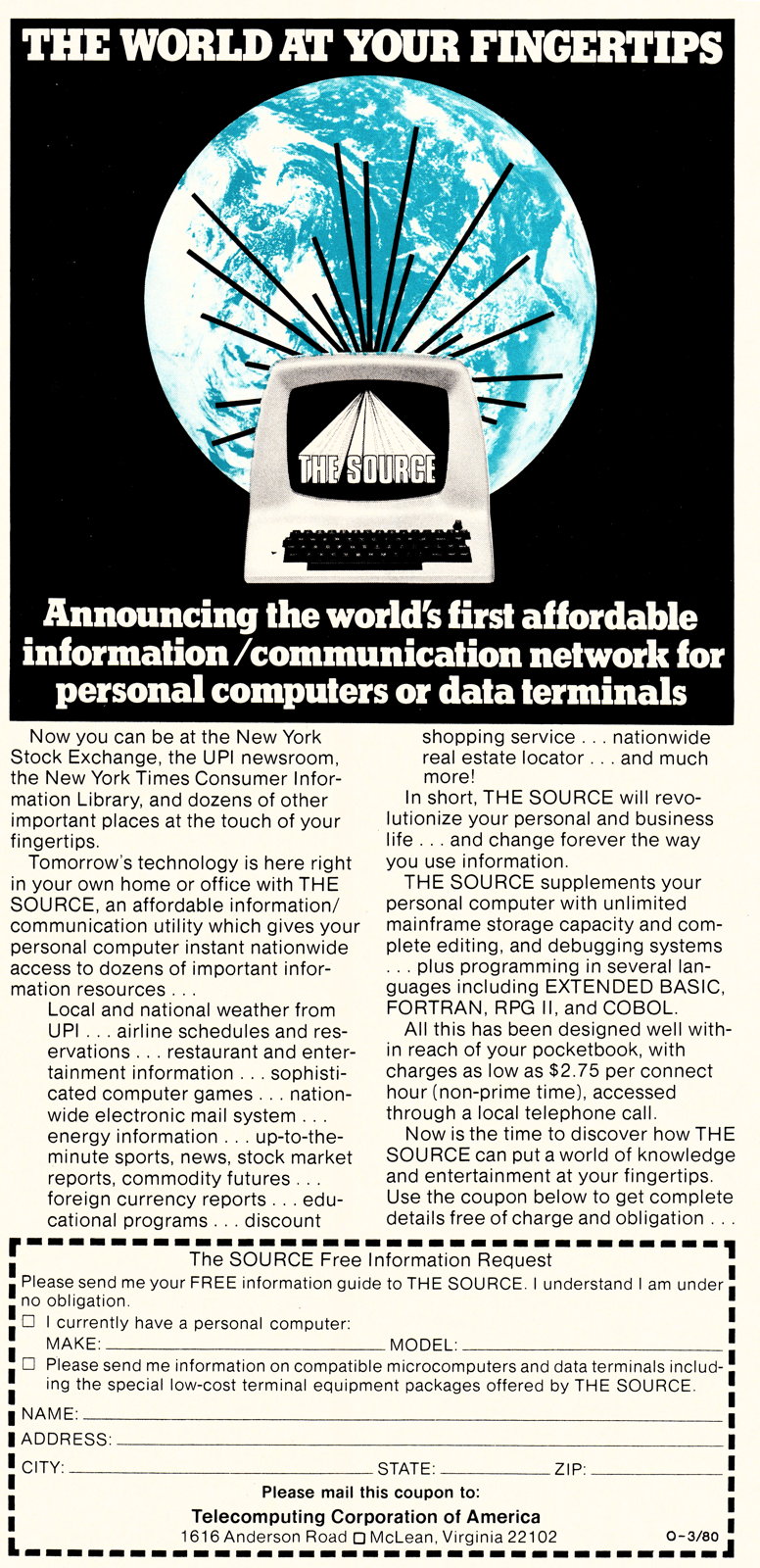 THE SOURCE supplements your personal computer with unlimited mainframe storage capacity and complete editing, and debugging systems… plus programming in several languages including EXTENDED BASIC, FORTRAN, RPG II, and COBOL.