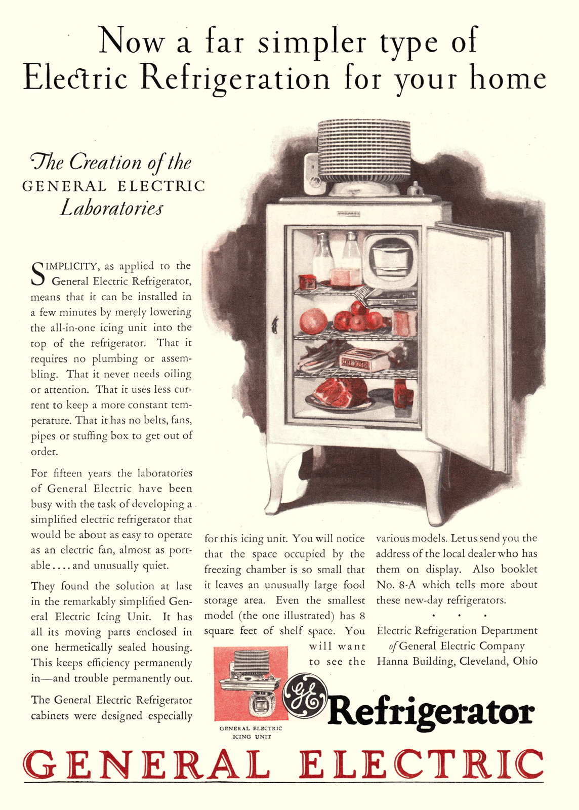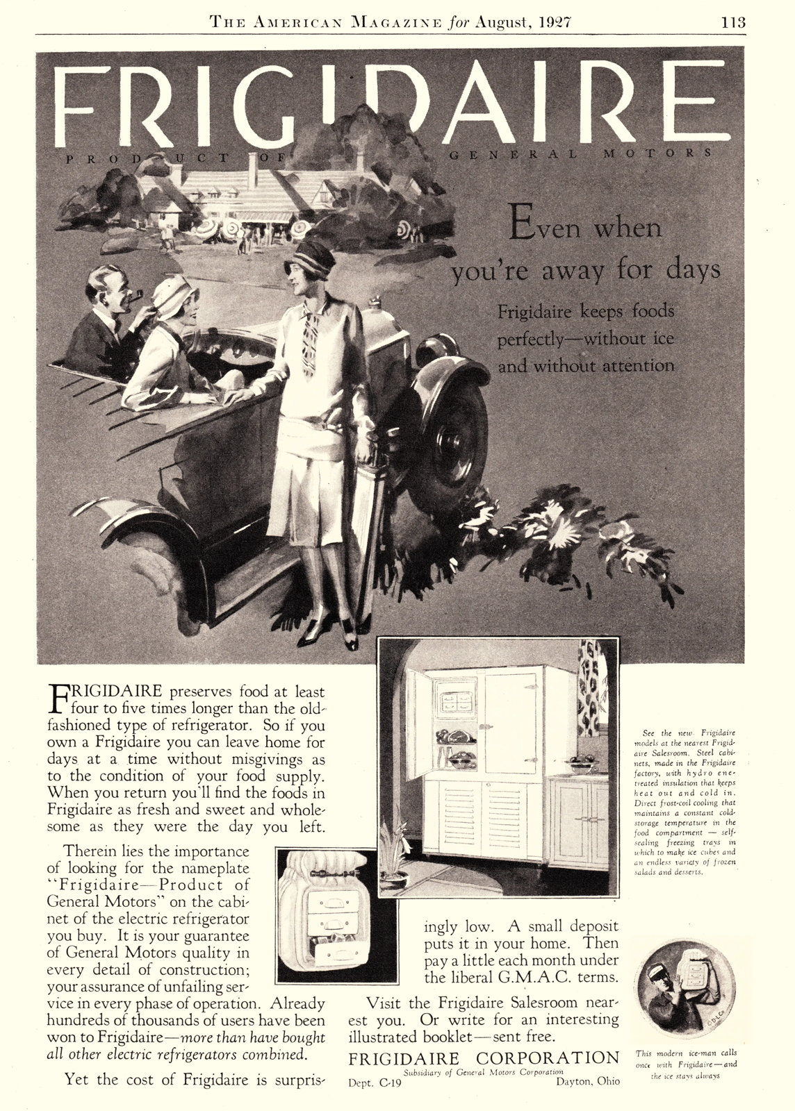 Another Frigidaire ad from 1927—ironically a few pages after one of General Electric’s first ads for their all-in-one unit—described the price for a Frigidaire as “surprisingly low. A small deposit puts it in your home. Then pay a little each month under the liberal G.M.A.C. terms.”