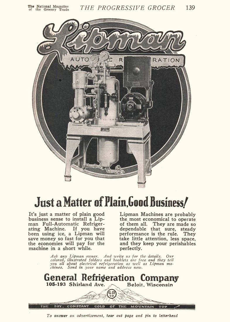 That pamphlet worried me a little. It looked like a cabinet that was also a refrigerator. Yet all of my sources put 1927 as the beginning of the modern home refrigerator/freezer, when General Electric brought out their “monitor top” model. Before the monitor top, home refrigeration was really the province of businesses, such as grocers, that could afford huge coolers—both the cost to buy them and the space to install them—and individuals similarly placed, wealthy enough to afford both a special refrigeration unit and the spare space in their home to put it.