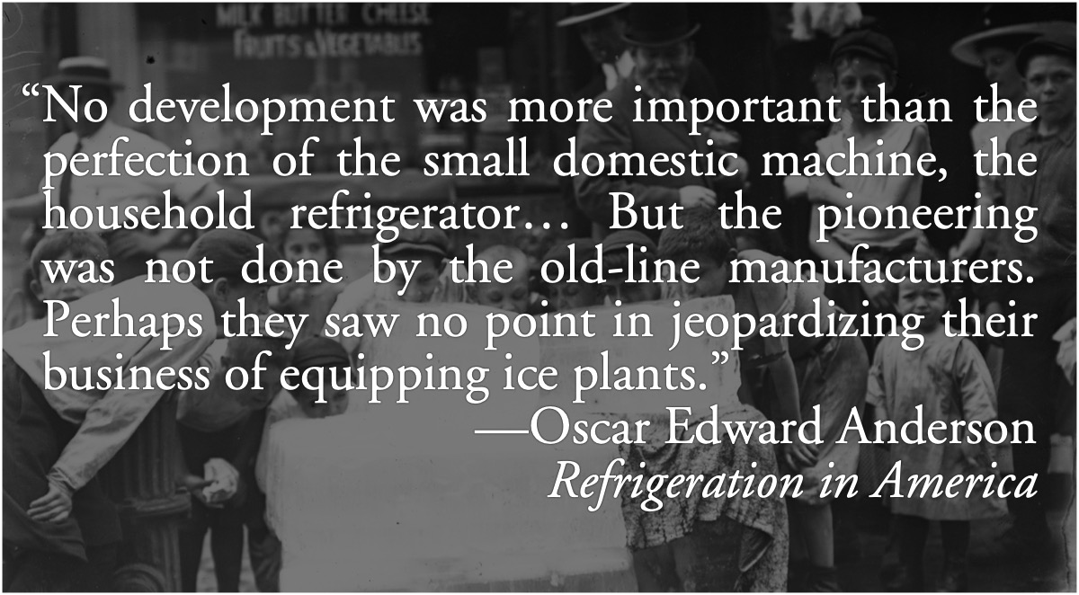 After 1927, on the other hand, refrigerators very much were a reason to get electricity. They were one of the driving forces for the spread of electrical power lines. Once General Electric changed the refrigeration industry, you wanted a refrigerator. And to get a refrigerator you had to have electricity.2