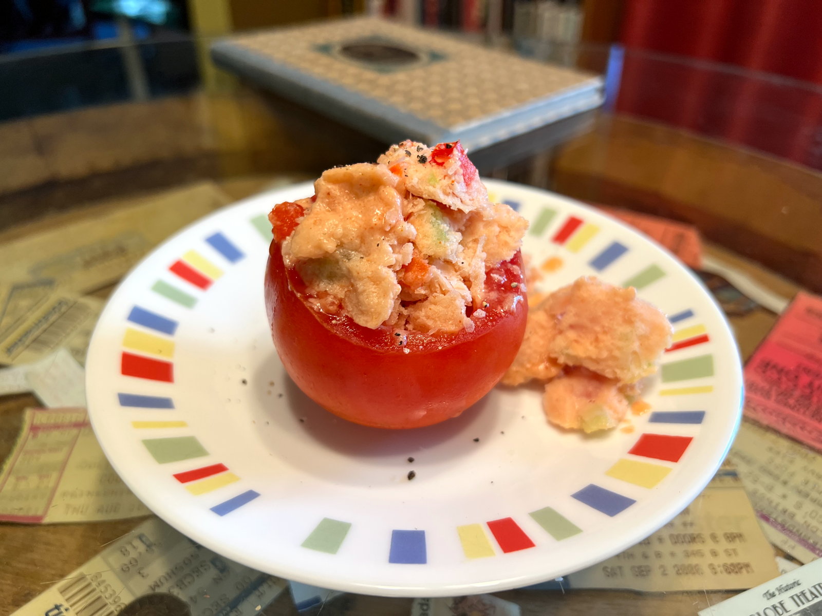 I expected the texture of frozen vegetable salad to be horrible. But it was fine, as was the flavor. Since it’s a filling to stuff a hollowed tomato, it appears to have been meant to be eaten with a knife and fork. It would be very nice with a good crisp and tender steak.