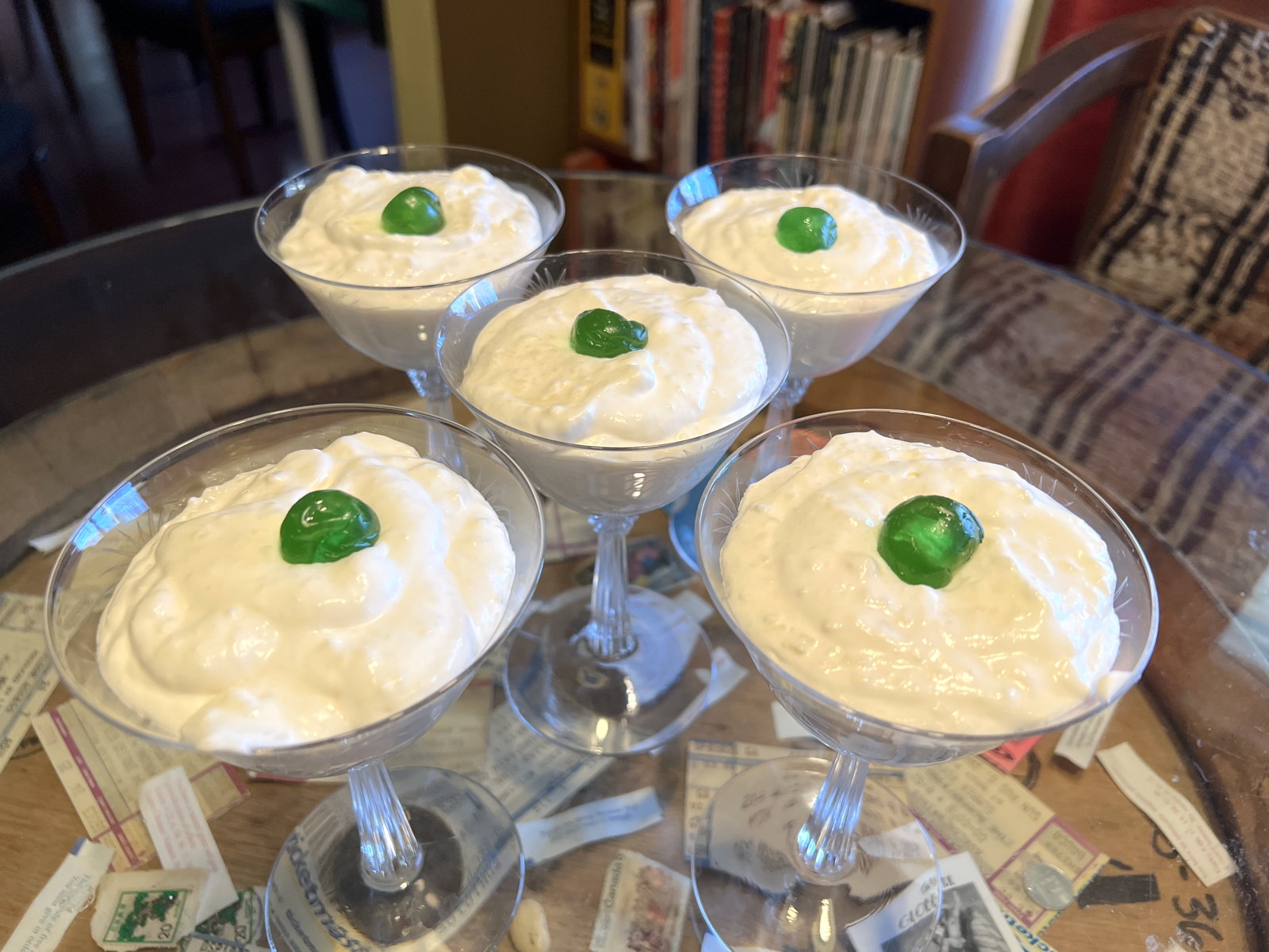 - Pour into five or six cocktail or parfait glasses.