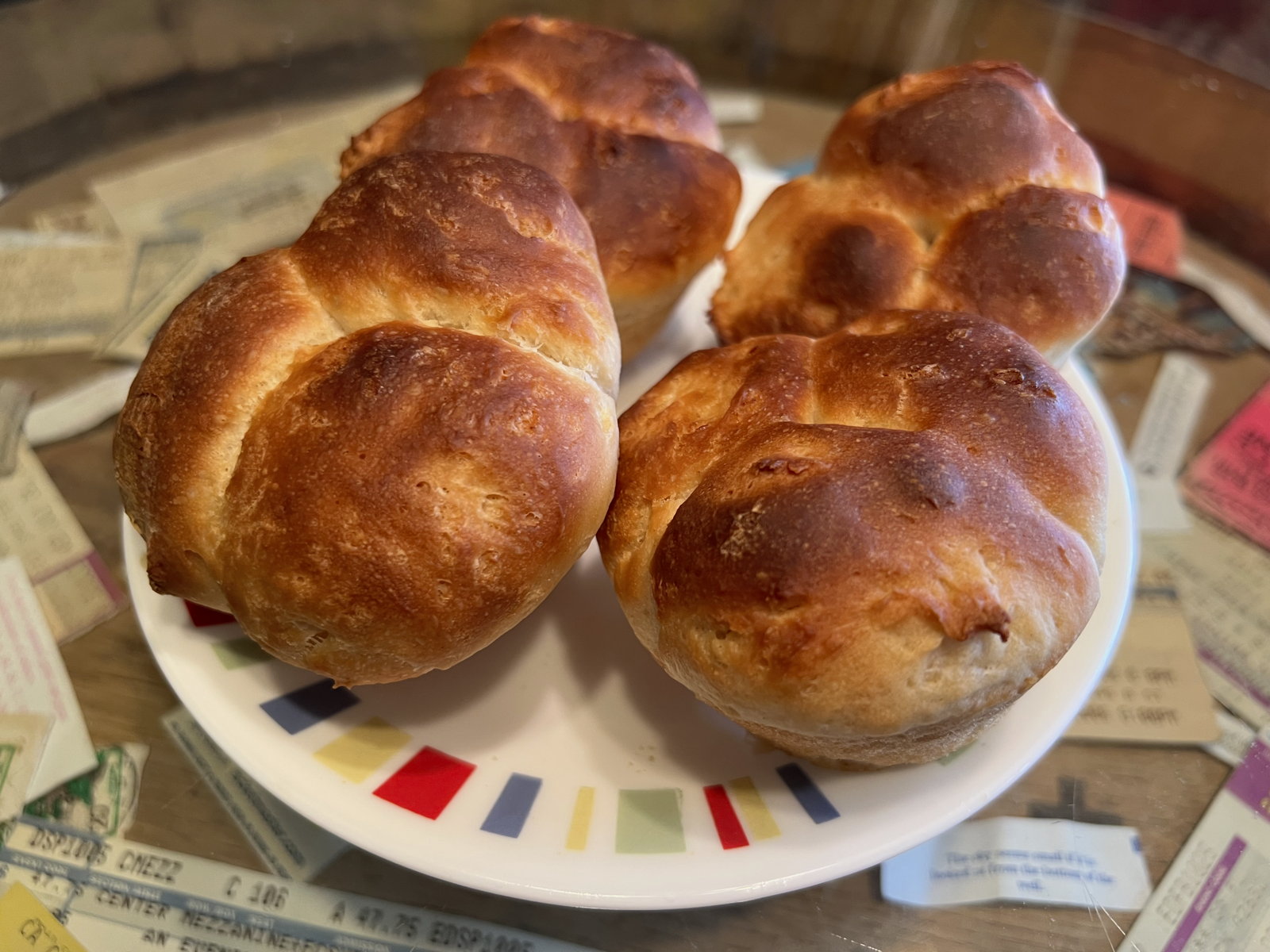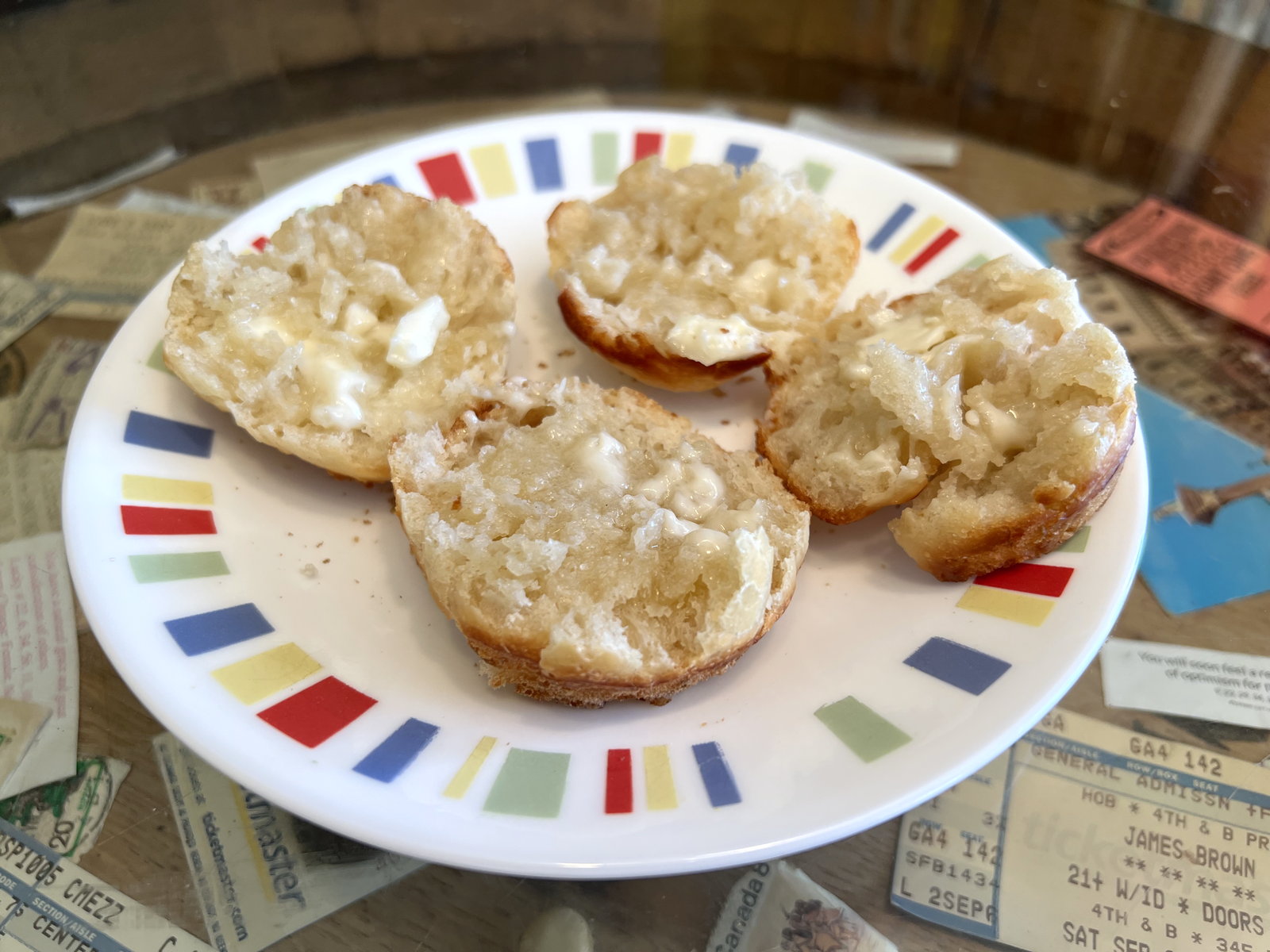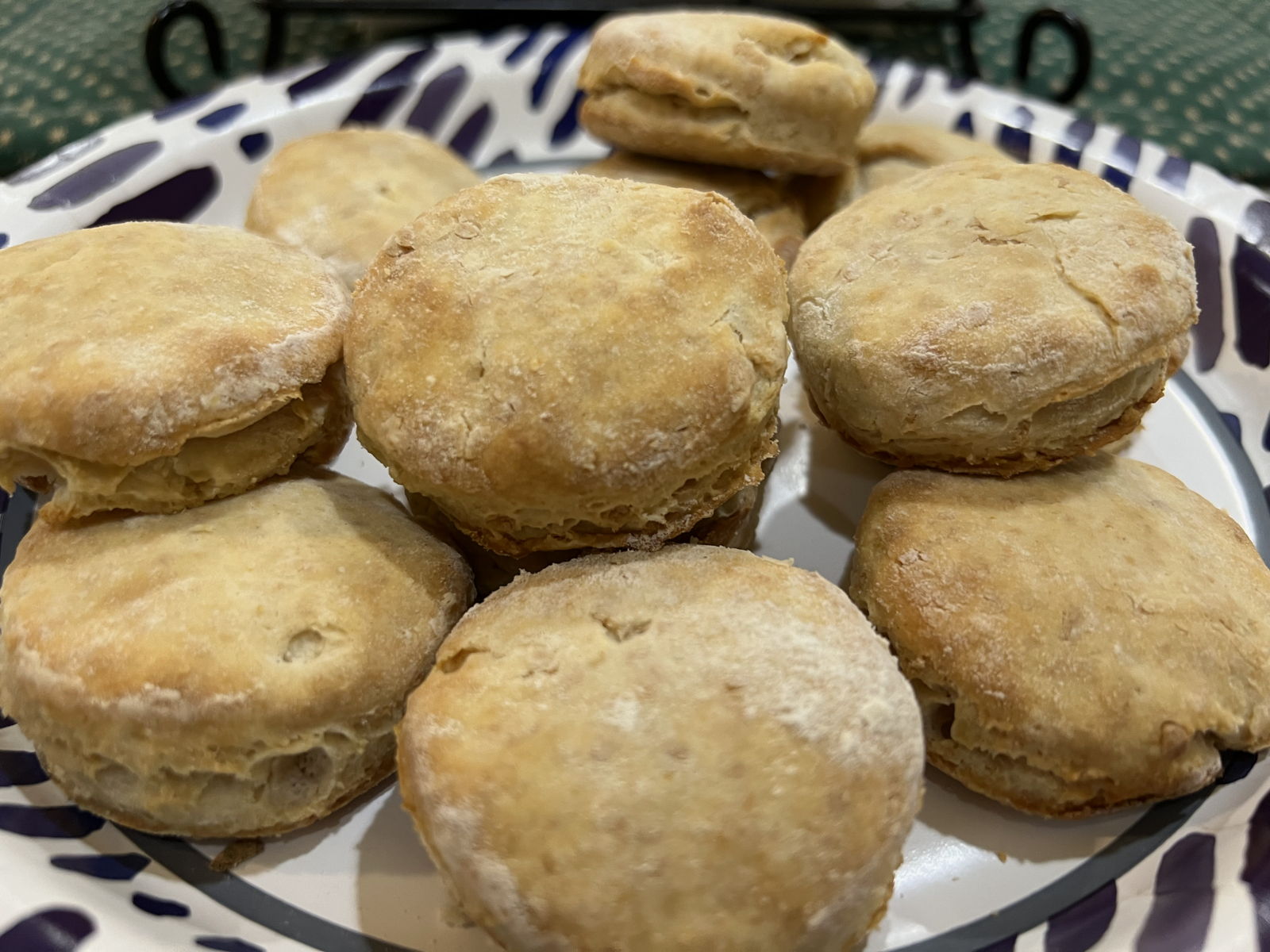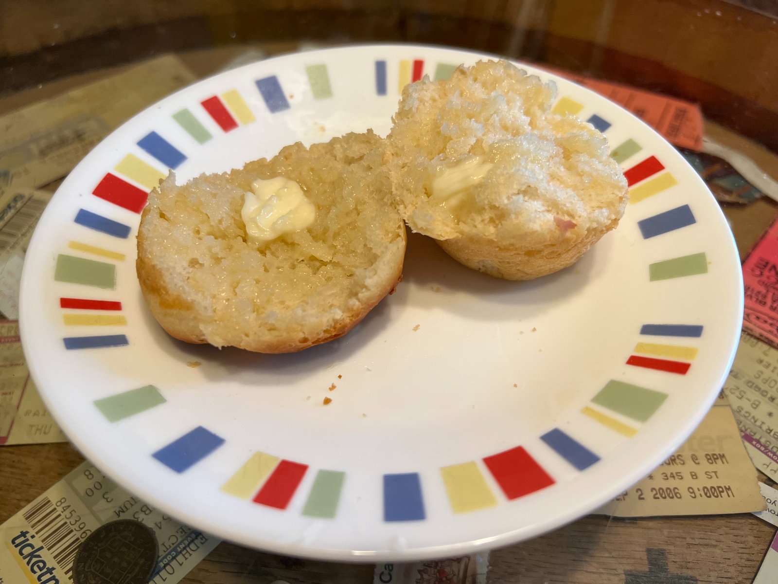 I tried the Peanut Butter Biscuits variation. They were unsurprisingly nice toasted and buttered, but were also great as the base for an applesauce shortcake. I did not try storing the dough in the refrigerator: the recipe only makes 14 biscuits, which is another interesting choice. The basic Baking Powder Biscuits recipe makes 28 biscuits. All of the specialty variations “are for half of above recipe”. This makes a lot of sense. Where basic biscuits are something you’d make over time, specialty biscuits would be made all at once for a gathering or special treat.