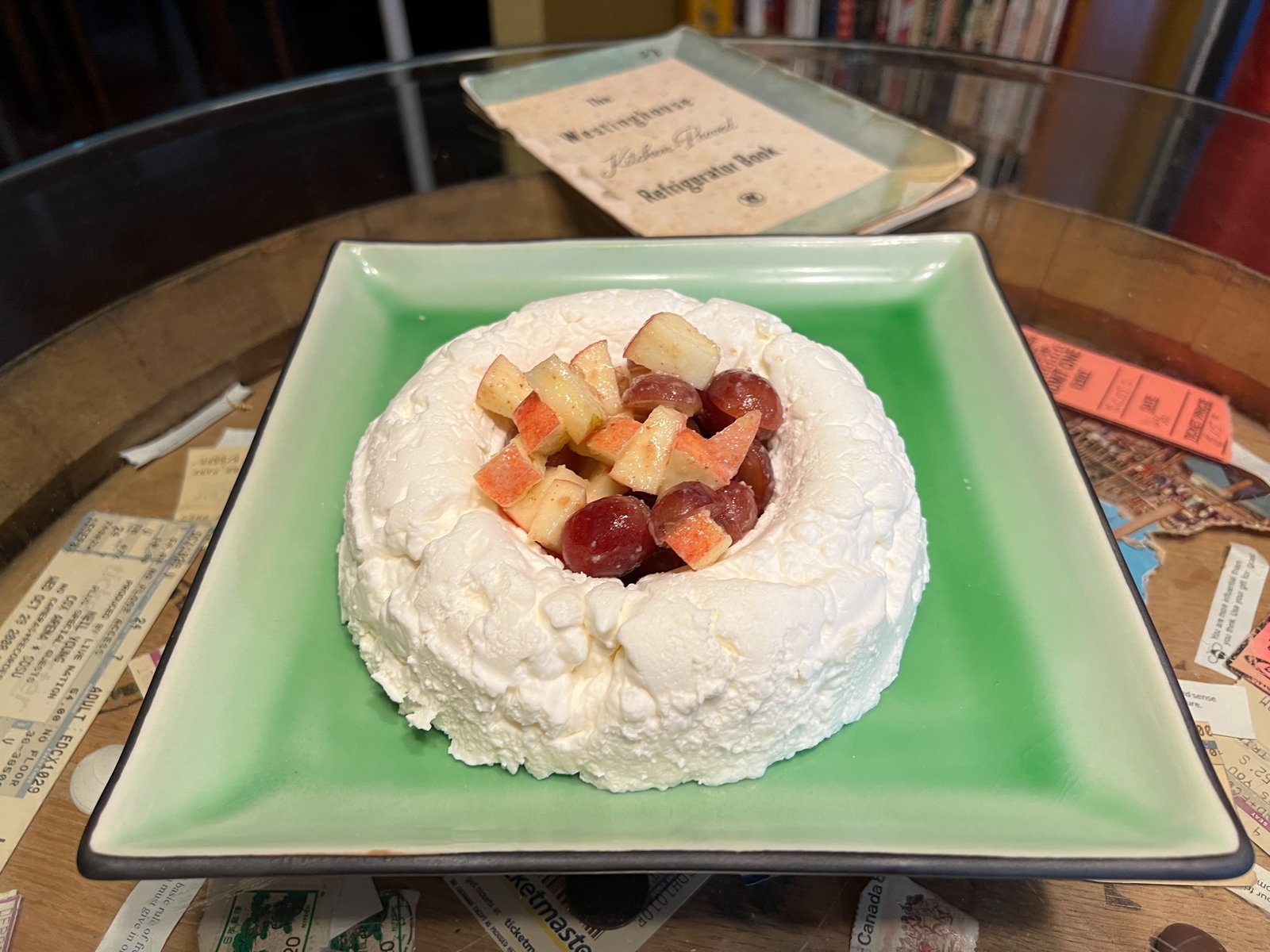 I tried two of the salads, both of which called for gelatin. For the Cottage Cheese Ring I really had no idea what to expect. That’s part of what appealed to me. It is definitely a buffet dish: the appearance was striking. Overall, it was bone-china white and the cottage cheese gave it a sort of marble or stone-like appearance. Filled, the ring would provide a remarkable contrast with the colors of the fruit or vegetables inside the ring.