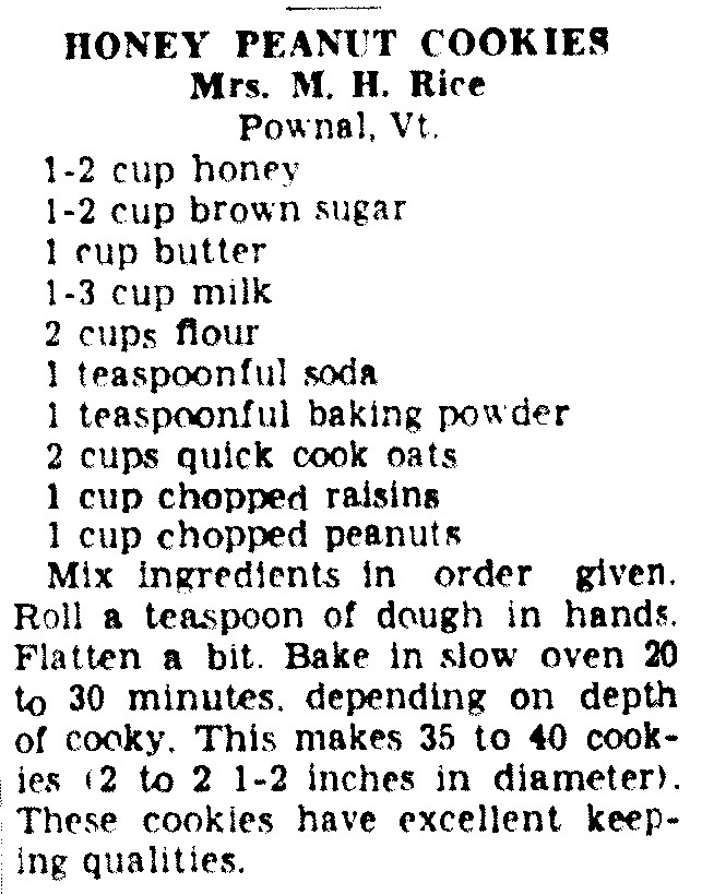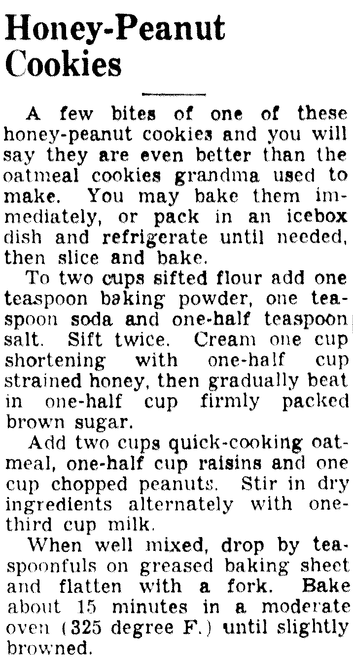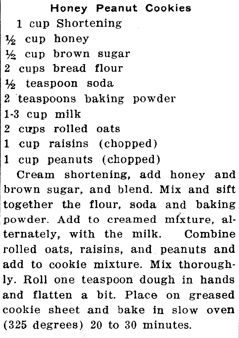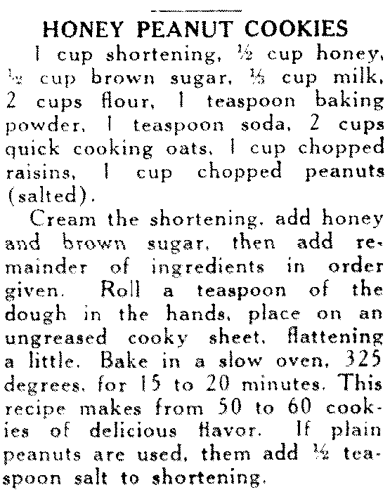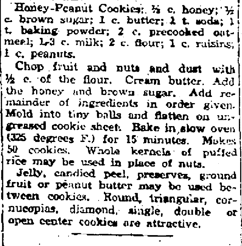 Throughout this history of Prize Honey Peanut Cookies, the recipes have variations such as three cups oatmeal instead of two, or suggesting puffed rice in place of the peanuts, or using only half the raisins—a variation toward the end of World War II. The November 22, 1940, Punxsutawney Spirit has the interesting note that the peanuts should be salted, and if not salted, to “add ½ teaspoon salt to shortening.” This is echoed in later copies of the recipe in other newspapers.