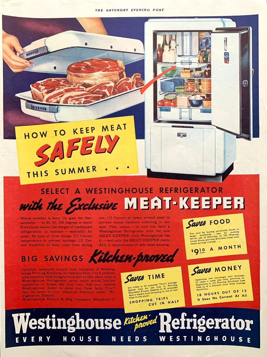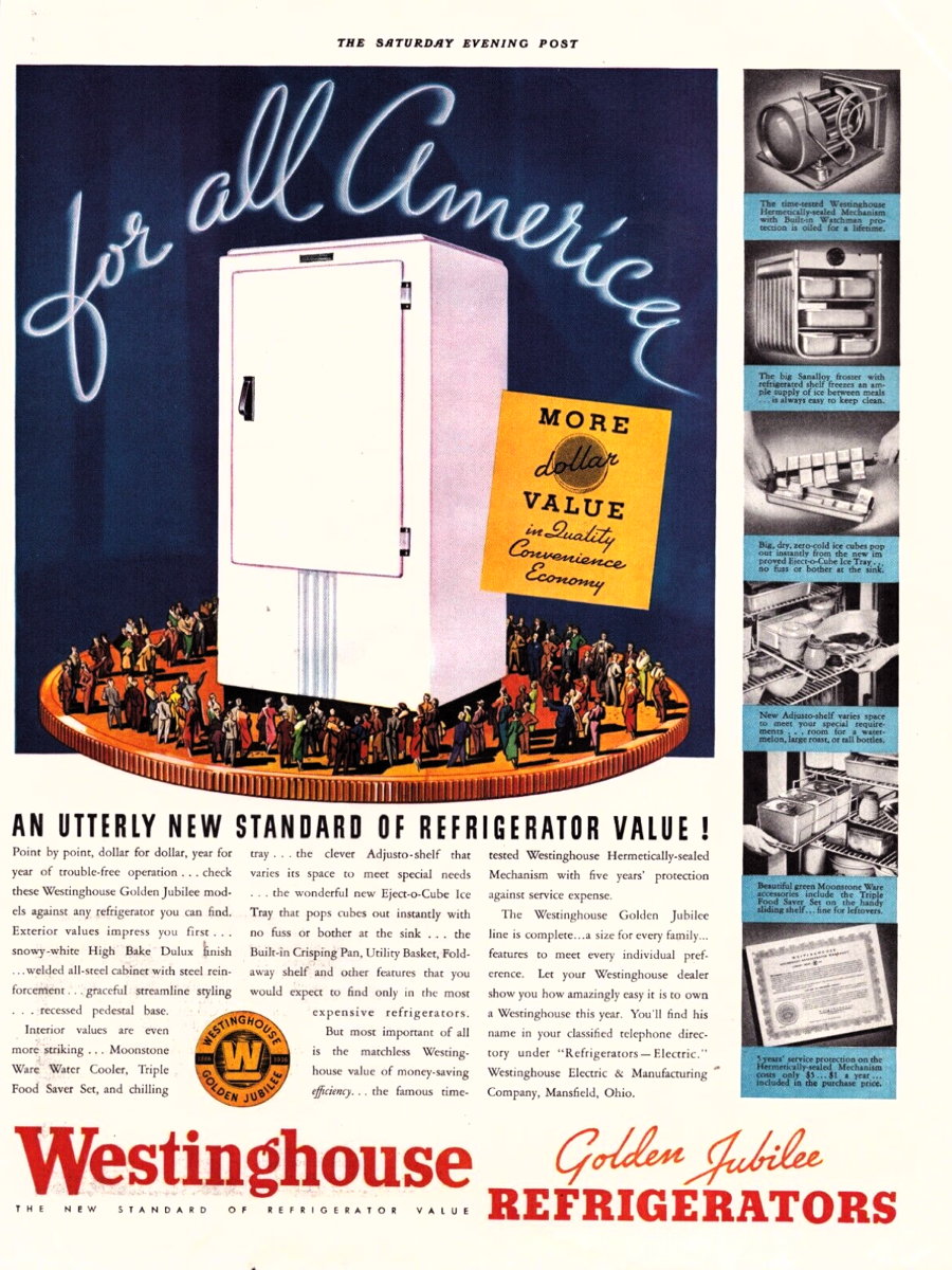 I’ve written so far about refrigerators in the twenties and refrigerators in the forties. While traveling over the Thanksgiving holiday last year I found an interesting Westinghouse book from 1937 or 1938. It provides a great opportunity to fill the gap and look at the thirties. If I’m right about the age, this book came out well after the end of Prohibition and well before the end of the Depression. Those who were paying attention to world affairs could see another Great War on the horizon, but for most people domestic concerns were a far greater priority.