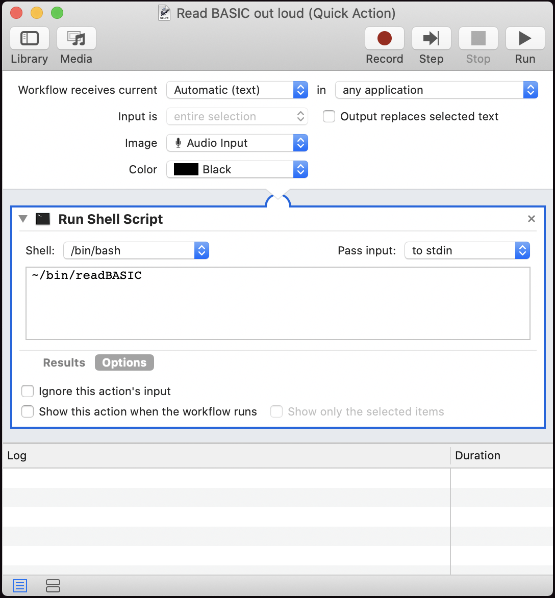 The script is most useful in the Services menu, so that you can highlight some text in a BASIC file and send it to the script. This is easily done by creating an Automator Quick Action. Unlike most Quick Actions that run shell scripts, this one has no need for checking “Output replaces selected text”.